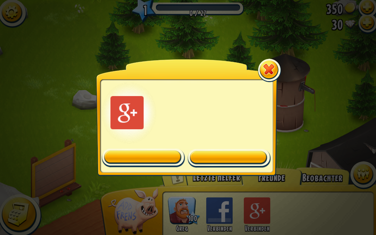 Hallo erstmal... also zur Sache....ich Spiele seit geraumer Zeit über mein smartphone Galaxy s4. Und habe über google+ auch immer über das Galaxy tab2 spielen können. So nun habe ich das galaxy tab 4.....und möchte auch hier meine Farm weiterspielen können....also klicke ich auf "mit google+ verbinden". Es macht sich dann ein Fenster auf in dem 2 Buttons sind.....es steht aber nichts in diesen buttons und auch ein klicken auf ein dieser Buttons bei gar nichts. ....so langsam verzweifel ich....ich versuche mal ein screenshoot anzuhängen .....ich bedanke mich schon mal für jegliche hilfe