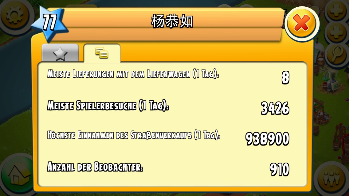#98 Alles anzeigenIch hab mal zwei dieser Farmen " beobachtet". Am ersten Tag hatten beide einen Namen in Chinesischen Schriftzeichen. Am nächsten Tag habe ich sie in meiner Freundesliste gesucht und geöffnet. Nur dass jetzt die Zeichen verschwunden waren und die Farmen "Shirley" und "Candy" hiessen. Am anderen Tag habe ich sie wieder geöffnet. Sie hiessen jetzt "Lamlam" und " Dicker131". Und am darauffolgenden Tag waren sie aus meiner Freundesliste verschwunden............