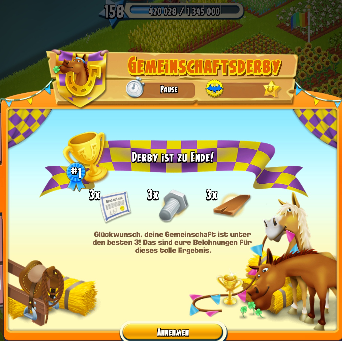 Am Dienstag morgen haben wir mit dem Derby angefangen, schon jagen drei GM an uns vorbei, und nach sieben Stunden ist die Erste fertig.😫Dann gestern morgen ( 7.40)Uhr) die beiden anderen bleiben genau vor der Zusatzaufgabe stehen. Wir arbeiten uns sehr mühsam Blüte für Blüte vor und stehen dann auch vor der letzten Zusatzaufgabe. Nach zwei Stunden (ca.16Uhr) die anderen haben sich stundenlang nicht mehr bewegt, kommt dann tatsächlich sprengen, angenommen und wir galoppieren auf den zweiten Platz.