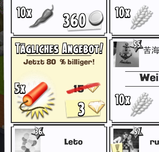 @Speckinator Die Angebote sind schon reell. Sie setzen sich mit dem Preis zusammen, wenn du z.B. eine Dynamitstange in die Mine wirfst, die aber nicht hast. Dann kannst du eine Stange für 3 Diamanten erwerben. Das funktioniert so mit allen Werkzeugen. Daher ist das in der Zeitung also schon ein Angebot, auch wenn es sehr teuer ist.