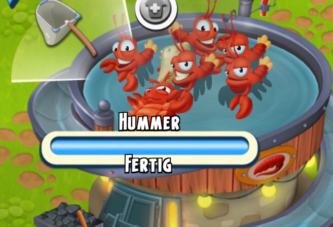 du musst als erstes Hummerfalle in der Seilerei produzieren. Wenn sie fertig ist und du sie eingesammelt hast, musst du sie in einen deiner freien Angelplätze werfen, und dann heißts wieder warten. Nach 6 Stunden hast du in der ausgeworfenen Hummerfalle einen Hummer. Klick die Falle in der Angelstelle an, dann landet der Hummer im Hummerpool. Nach 6 Stunden im Hummerpool ist der Hummer fertig, das erkennst du daran, dass er mit dem Bauch nach oben liegt. Dann kannst du ihn ernten wenn du auf den fertigen Hummer klickst, dafür ziehst du dann einfach diesen Kescher (oder was das sein soll) zum Hummer, und das Endprodukt, der Hummerschwanz, landet in deiner Scheune.
