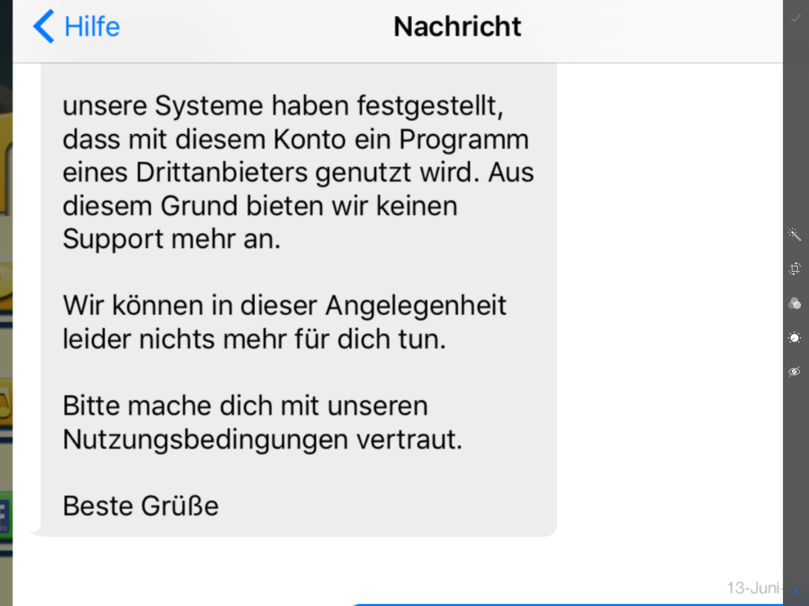 #10 Ich habe in der Hinsicht keinerlei Erfahrung. Aber ich würde an deiner Stelle ganz normal weiterspielen (soweit es halt eben geht) und noch auf die Antwort warten (die kann manchmal auch ein paar Tage dauern, besonders jetzt kurz vor dem Update). Vielleicht fällt dir auch noch irgendwas ein, warum die vielleicht auf die Idee gekommen sein könnten, dass du manipuliert haben solltest.