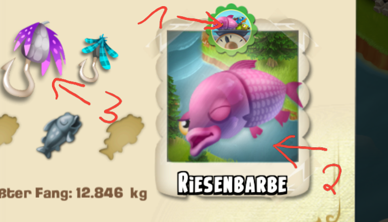 - 2 = schaue bei jeder Fischart genau auf kleine Randdetails der Gewässerabbildung. Dann erkennst Du, in welcher Gewässerparzelle der Fisch gefangen wurde.