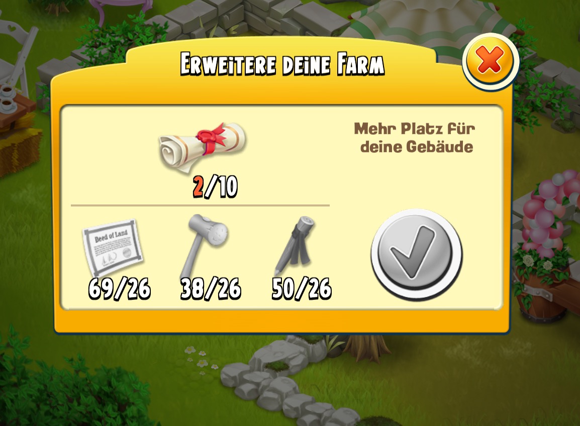Finde allerdings äußerst selten Kisten, da mir die Geduld fehlt auf jeder Farm zu suchen ist sie nicht im nahen Umkreis vom Farmhaus, war es das für mich mit suchen miffySchade das ich nicht gerade erweitern kann .... bei mir ist ein Stük Land billiger geworden ... nur noch je 26 Teile