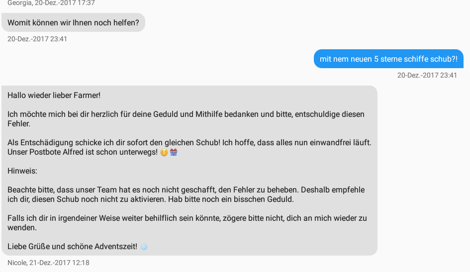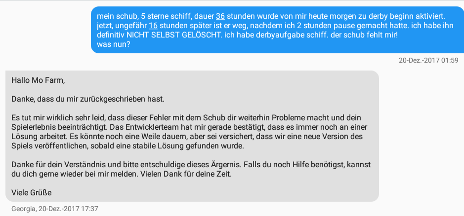 , schön dasss du mir geantwortet hast.Du hattest sicher einen schlechten Start mit dem Support, denn eigentlich sind die Mädels und Jungs dort, sehr hilfsbereit. Vergiss bitte auch nicht, du mailst dort nicht einen bestimmten an. Eigentlich ist das vergleichbar mit einem nicht deutschsprachigen Callcenter, die stets versuchen uns Spielern zu helfen, wenn es geht.