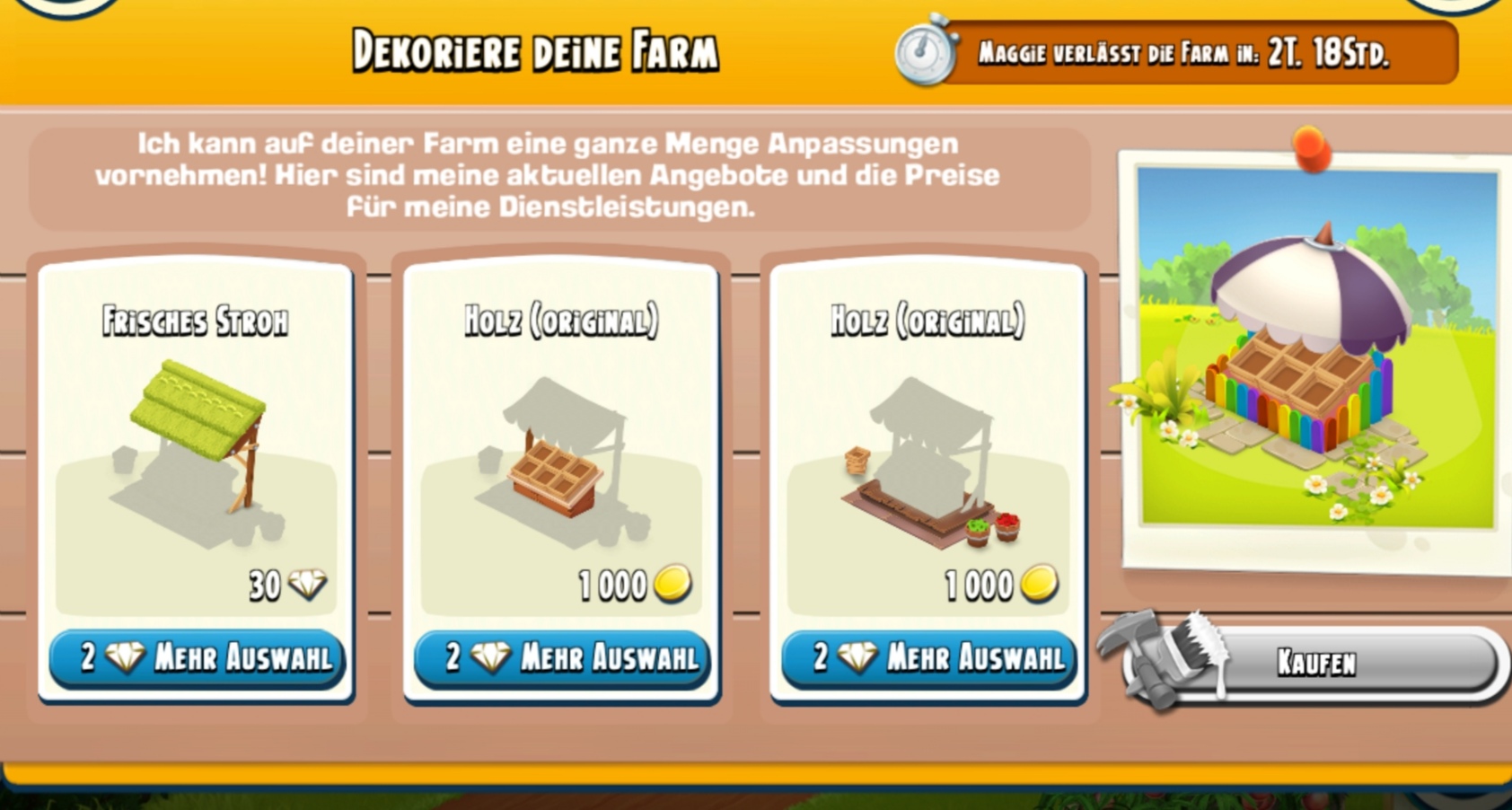 Maggie bietet mir hier zweimal das Design "Holz (original)" für 1000 Taler an. Diese habe ich bereits (hat jeder, da original) und wenn ich ins Sammelbuch schaue, kann ich die jeweils für 250 Taler erneut anbringen. Bei Maggie steht dazu aber keinerlei Hinweis. Das ist eine absolute Frechheit! :seriously: Man muss ganz genau aufpassen, was man bei Maggie erwirbt, und am besten mehrfach ins Design- und Sammelbuch schauen.