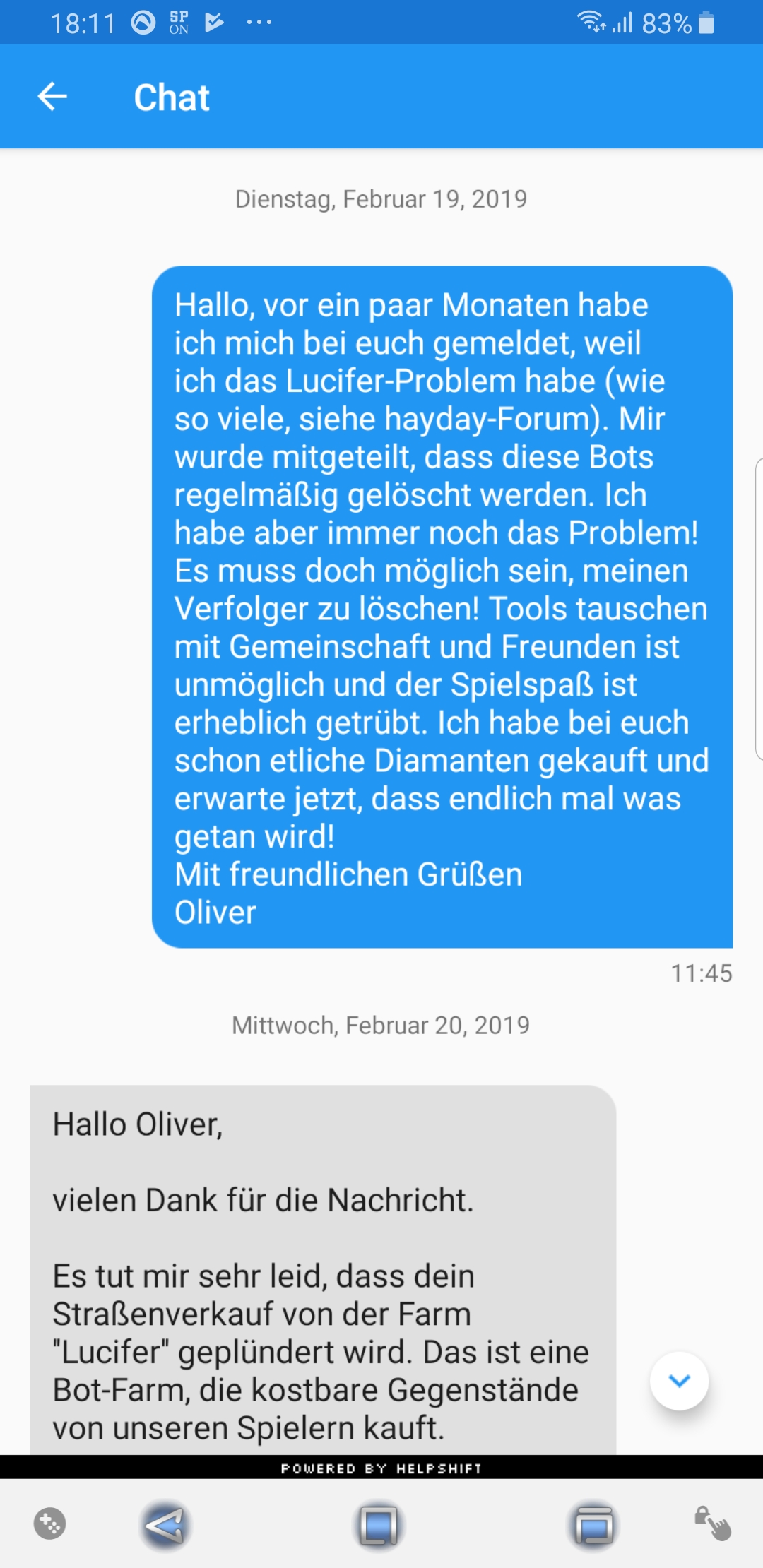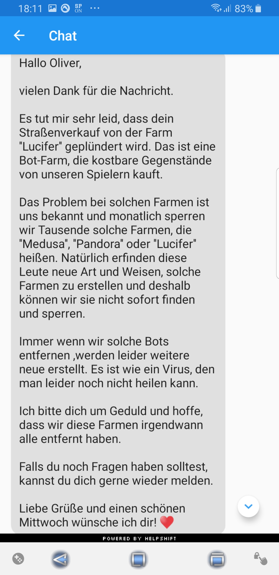 Nach so langer Zeit könnten sie es doch mal schaffen. Programmieren dass keiner mehr lucifer heißen darf und am Besten wäre es sowieso, dass man nach Namen suchen kann nicht nur nach Kürzel und dann somit alle blocken kann. Was auch nicht schlecht wäre ist, es gibt doch den Button um nachzuschauen wer bei dir geholfen hat, dort kann man auf die farmen zugreifen. Sie könnten dies auch machen, wenn jemand in deinem Laden die Sachen kauft, dass man da auch nachschauen kann. Somit könnte man selbst alle blocken. -