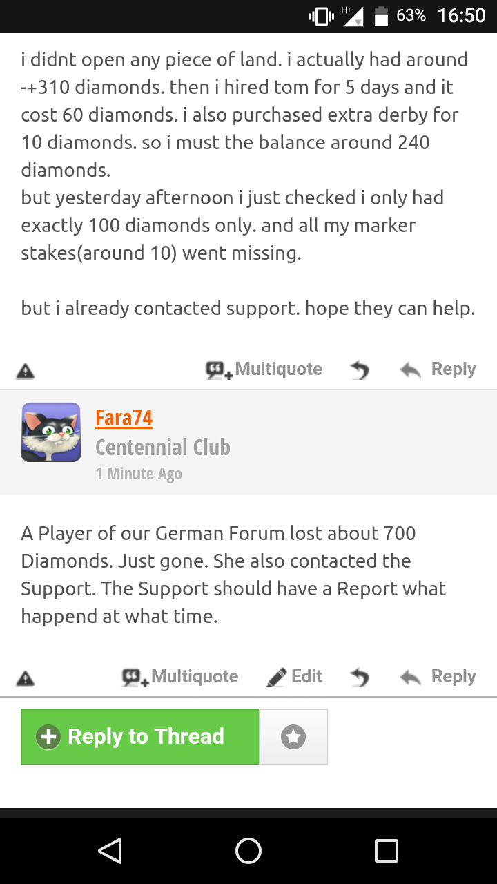 Im offiziellen SC Forum berichtet eine Spielerin auch einen Verlust von Diamanten, ein Mod dort hatte direkt gefragt ob sie versehentlich Land mit Dias freigeschaltet hatte, aber dies verneinte sie.