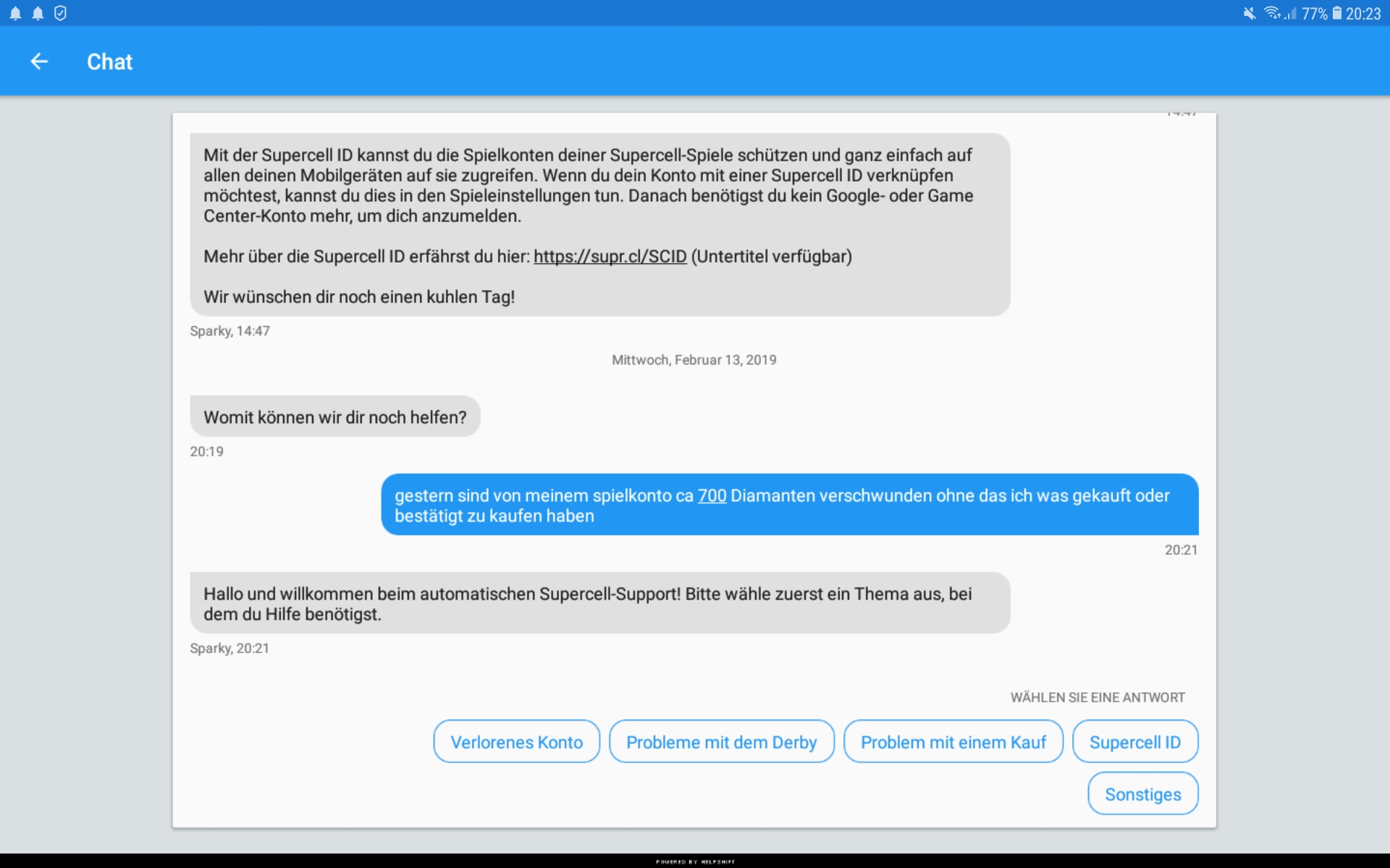 Your Supercell Support Team February 12, 2019, 21:42 +0100 Diamanten verschwundenHallo heute sind mir im Spiel ca 700Diamanten verschwunden ohne das ich was