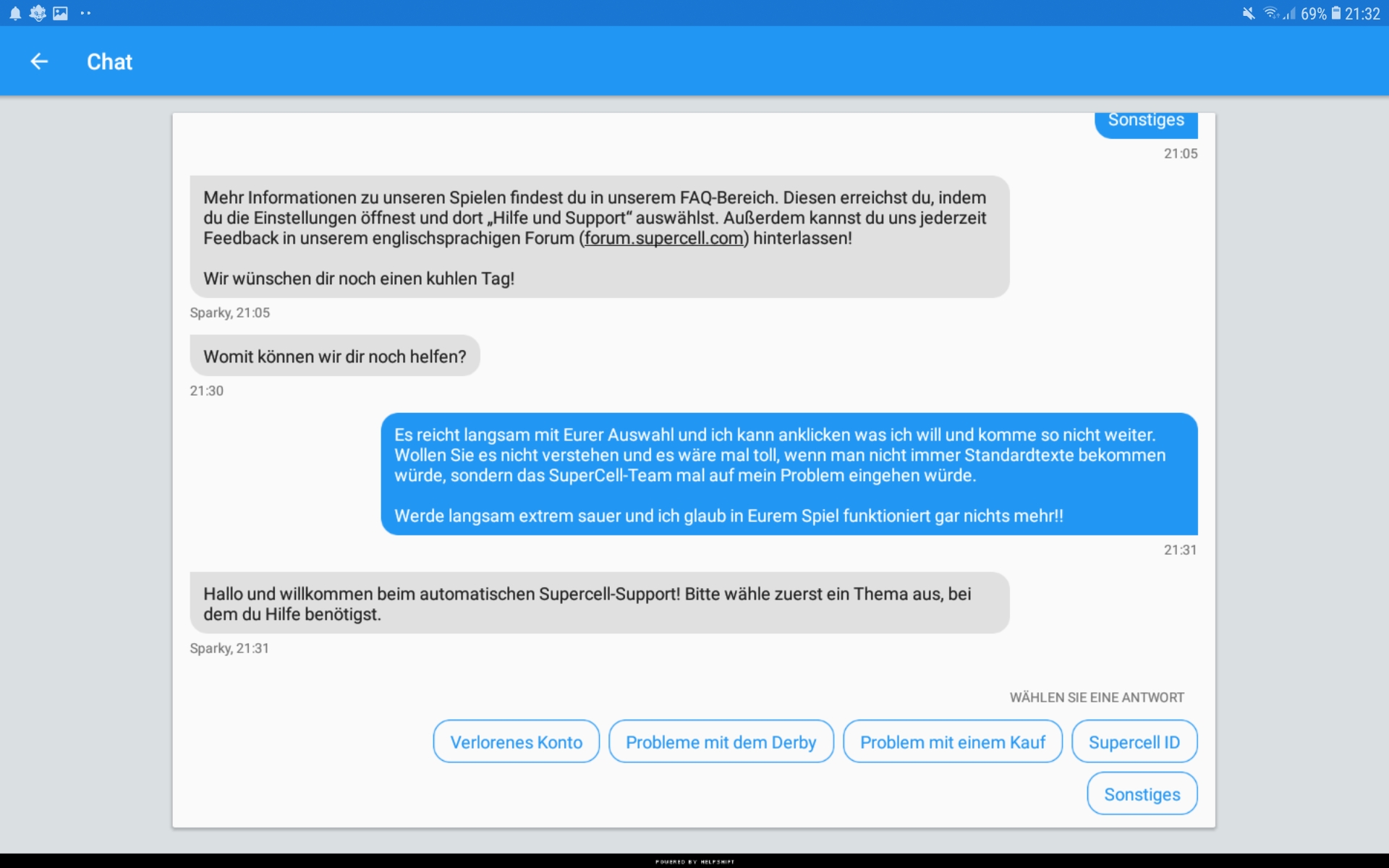 Hallo, Danke, dass Sie uns kontaktiert haben! Dies ist eine automatische Antwort, die Ihnen bei den häufigsten Problemen sofort hilft. Kann die Antworten nicht finden, nach denen Sie suchen? Blättern Sie dann bis zu "Kontakt" und senden Sie uns eine Nachricht. Wir werden uns so schnell wie möglich bei Ihnen melden! 1. BRAUCHEN SIE HILFE ODER BERATUNG BEI SPIEL- ODER RESSOURCE-PROBLEMEN? Wenn Sie Zugriff auf Ihr Spiel haben, aber Hilfe beim Spielen, beim Kauf im Spiel usw. benötigen, gehen Sie einfach zu Einstellungen> Hilfe und Support Ihres Spiels und prüfen Sie, ob Sie die Antworten finden, nach denen Sie suchen die FAQ. Bitte beachten Sie, dass die FAQs die auf Ihrem Gerät eingestellte Sprache widerspiegeln. Stellen Sie daher sicher, dass Ihr Gerät auf die Sprache eingestellt ist, mit der Sie das Spiel spielen möchten. Sie können die FAQs auch unter support.supercell.com aufrufen. 2. VERLIEREN SIE DEN ZUGRIFF AUF IHR SPIELKONTO? Stellen Sie zuerst und vor allem sicher, dass Sie die neueste Version des Spiels installiert haben. Es kann vom App Store oder vom Google Play Store auf Ihrem Gerät heruntergeladen werden. Wenn Ihr verlorenes Spiel mit Facebook verbunden war (nur Hay Day!): - Geben Sie die Einstellungen Ihres Geräts ein. - Melden Sie sich bei Ihrem eigenen Facebook-Konto an (vergewissern Sie sich, dass sich die neueste FB-Version auf Ihrem Gerät befindet). - Öffnen Sie Hay Day - In Ihren Spieleinstellungen (obere linke Ecke Ihrer Farm), tippen Sie auf "Mit Facebook anmelden". Wenn Ihr verlorenes Spiel mit Game Center verbunden war (nur iOS) - Geben Sie Einstellungen> Game Center Ihres Geräts ein - Stellen Sie sicher, dass Sie mit Game Center angemeldet sind Richtige AppleID - Starten Sie Ihr Spiel, und die Option zum Laden Ihres Spielkontos wird angezeigt. Wenn Ihr verlorenes Spiel mit Google Play verbunden war (zuvor Google+ Sign-In, nur Android) - Gehen Sie in Ihr Spiel - Gehen Sie zu Einstellungen - Tippen Sie auf "Verbinden mit" Google"; Wenn Sie mehrere Google-Konten auf Ihrem Gerät haben, wählen Sie das richtige im Menü aus. - Die Option zum Laden Ihres Spielkontos wird angezeigt. Wenn keine der oben genannten Optionen funktioniert, gehen Sie zu Ihren Einstellungen und klicken Sie auf "Hilfe und Support" Scrollen Sie nach unten zum Abschnitt "Kontakt". Um eine Nachricht aus dem Spiel heraus zu senden, geben Sie bitte die folgenden Informationen an: Den genauen Namen der Basis / Farm / des Dorfes Das genaue Level davon Der Name der Allianz / Nachbarschaft / des Clans, die Ihr Spiel gehörte Erklären Sie, wie Sie Ihr Spiel verloren haben eine iTunes- oder Google Play-Quittung Ihrer allerersten Edelstein- / Diamantbestellung, wenn Sie eine gemacht haben Geben Sie uns Bescheid, wenn Sie sich über das Gerät, mit dem Sie Ihr Spiel auf 3 wiederherstellen möchten, an uns wenden. KONTAKTIEREN SIE UNS Wenn Sie die Option haben, bitte immer Bitte kontaktiere uns innerhalb des Spiels (antworte nicht auf diese E-Mail). Andernfalls antworten Sie auf diese E-Mail oberhalb der gepunkteten Linie oben in der Nachricht. Unser Player-Support-Team wird Ihre Anfrage so schnell wie möglich bearbeiten. Nochmals vielen Dank für das Einschreiben! - Ihr Supercell-Supportteam ### Antworten Sie nicht unterhalb dieser Zeile. ### Supercell 12. Februar 2019, 21:42 +0100 Hallo,Danke, dass sie uns kontaktiert haben! Dies ist eine automatische Antwort, die Ihnen bei den häufigsten Problemen sofort hilft. Kann die Antworten nicht finden, nach denen Sie suchen? Blättern Sie dann bis zu "Kontakt" und senden Sie uns eine Nachricht. Wir werden uns so schnell wie möglich bei Ihnen melden!
