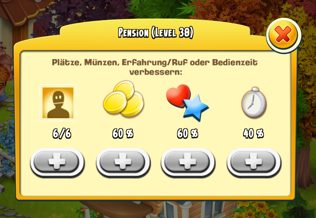 Bei Pension gab es ne Ausnahme, da hab ich nach den Plätzen zuerst die Zeit verbessert.Den Lebensmittelladen habe ich immer als letztes verbessert, er kostet einfach zuviele Scheunentools und wirft am wenigsten Gewinn ab. Käse, Marmeladen etc. gibt es bei mir dort nicht.... die meisten Besucher fliegen dort bei mir unbedient raus.