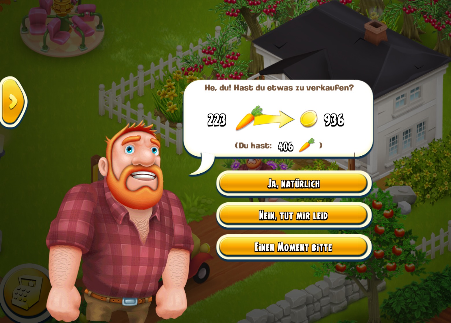 Komisch, haben wir alle jeden Tag die gleichen Aufgaben? Hatte heute auch Möhren, Lkw und Hühner füttern. Und Möhren ging ganz gut, hab insgesamt 100 Sonnen geholt, davon waren bestimmt an die 800 Möhren Pflanzen dabei. Da ich nur alle Stunde mal kurz gucken kann, stand gefühlt recht regelmäßig alle 2-3 Stunden ein Möhren-Bettler vor der Tür. Hab keine einzige verkauft, im Gegenteil, hab zum Abend hin Möhren für 1 Münze aus der Zeitung aufgekauft, weil da immer noch Möhren-Bettler zu mir kommen :D