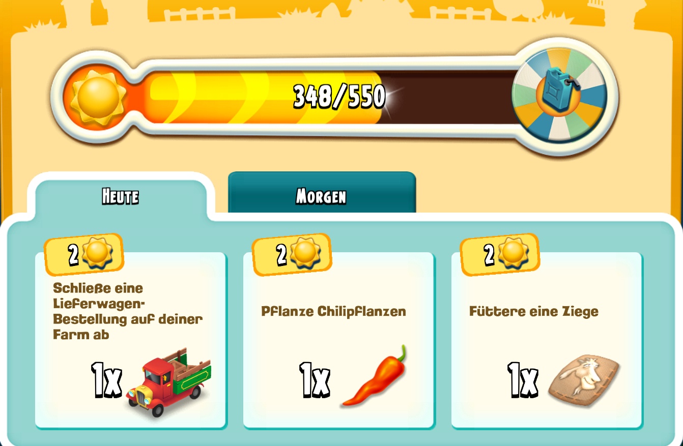 Ich habe mir den Shop genau angeschaut, was ich haben will und was das kostet. Ich habe 2 Röllchen für blaue Marken, eins für grüne und 1 gemischtes. Danach wähle ich die Häuser aus, die ich anfahre. Ein blaues und das grüne Röllchen habe ich schon zusammen. Für Hühner verschwende ich kein Benzin, ich sammle sie nur, wenn sie auf dem Weg liegen. Unser Tal hat schon 70 zusammen, das reicht auch so.