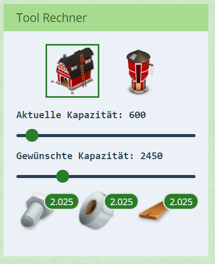 Ab sofort gibt es ein neues Gimmick, den HayDay Tool Rechner. Mit ihm könnt ihr euch berechnen lassen wie viele Tools für eine gewisse Kapazität notwendig sind.