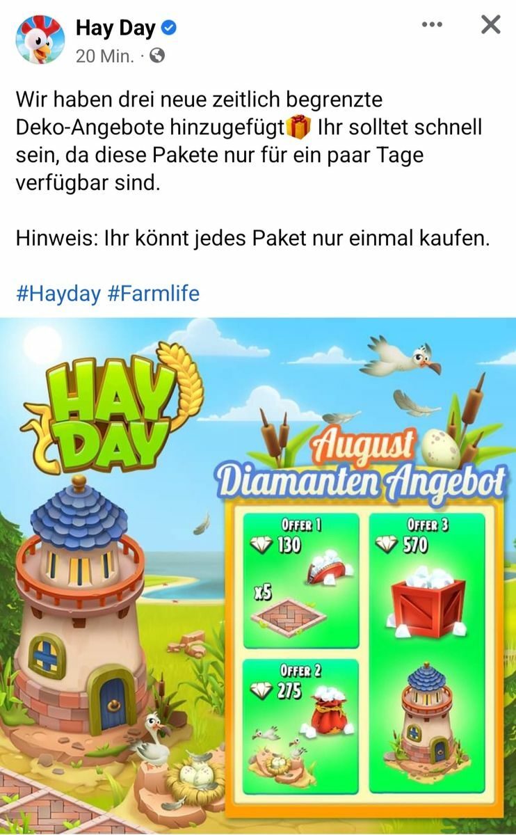 #299 So natürlich sind dieses Dekos überteuert keine Frage auch wen Hay Day meint ihr zahlt ja die Dias die Deko ist gratis aber die meisten Kaufen es ja ehr wegen der Deko und das mit dem Zeit Stempel ist auch nur Marketing weil es einen Zeit Druck auslösen tut und die Person die die Deko teile unbedingt haben will wird sich das auch kaufen so man kann die Diamanten Deko Angebote so oft Kaufen wie man will weil so macht Hay Day ja auch mehr Geld aber ihr habt Recht Ich finde es auch langsam übertreiben die extremst!