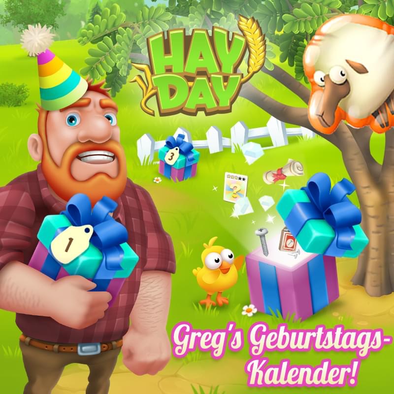 #5 Um den Geburtstag 🎂 von Hay Day zu feiern, hat Greg einen besonderen Kalender auf seiner Farm! Besucht doch jeden Tag Gregs Farm und tippt auf die tägliche Geschenkbox 🎁, dann erwartet euch eine besondere Belohnung. Darunter eine exklusive Dekoration!