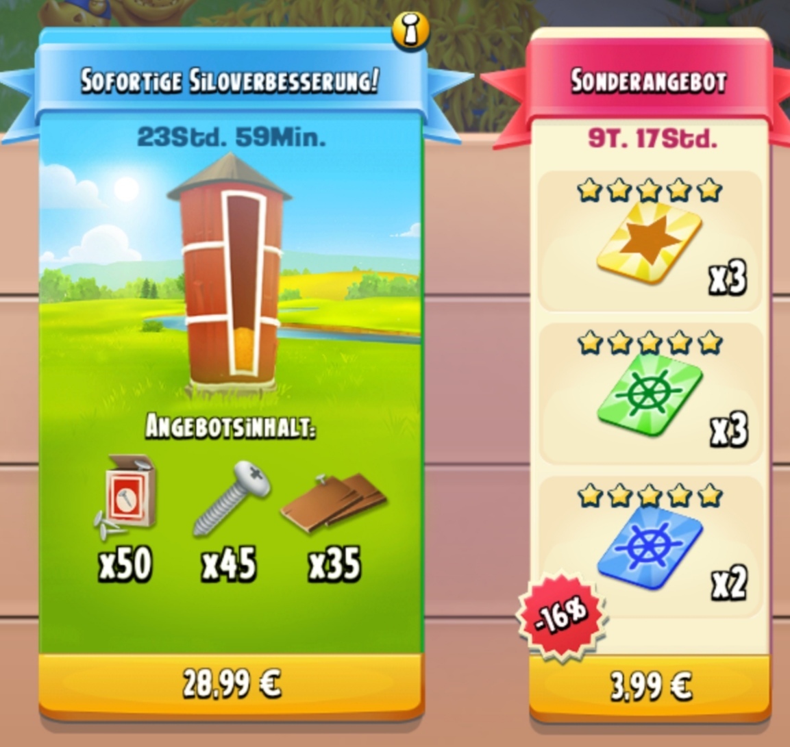 #12 Gestern und heute gab es jeweils 3 5-Sterne Schübe für die Stadt, für 29 Dias. Da habe ich zum ersten Mal was von den Angeboten gekauft. Diese Schübe liebe ich, wenn die Stadtbesucher Tools für Scheune und Silo bringen. Da bediene ich immer so viele wie möglich, mein Lieblingsevent. Und die Schübe sind echt rar bei mir. Das war mal ein gutes Angebot