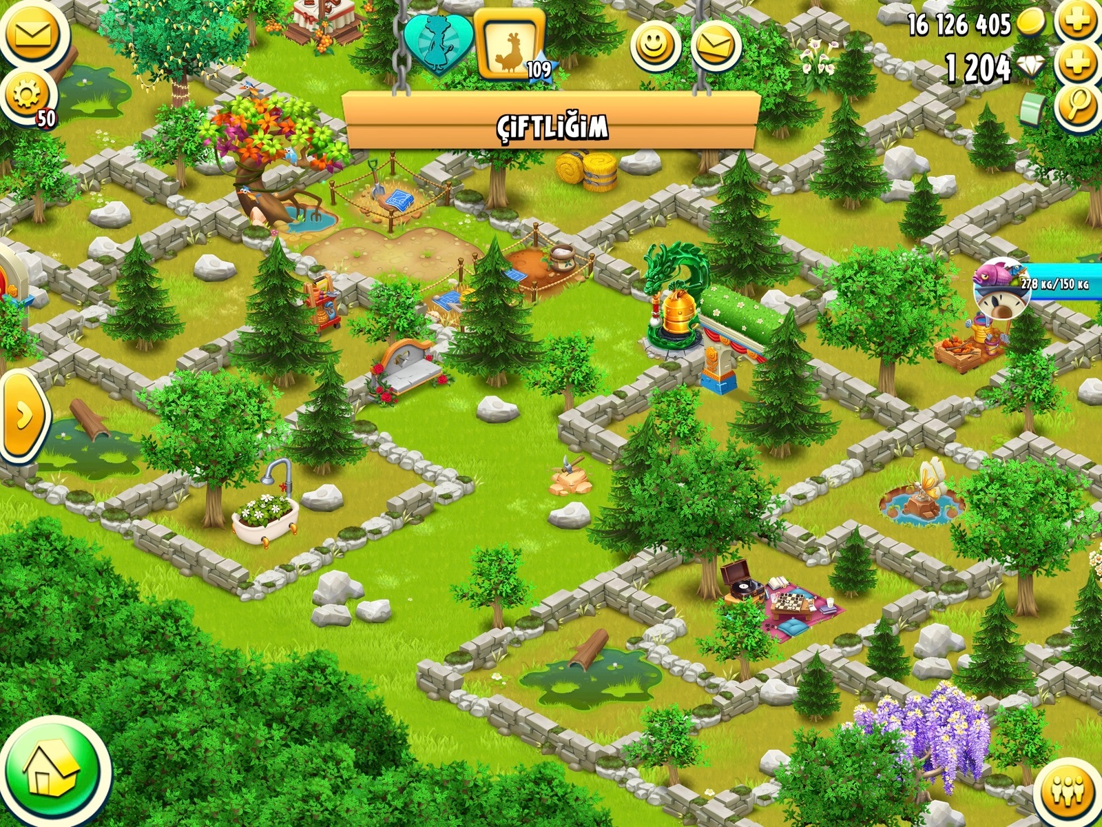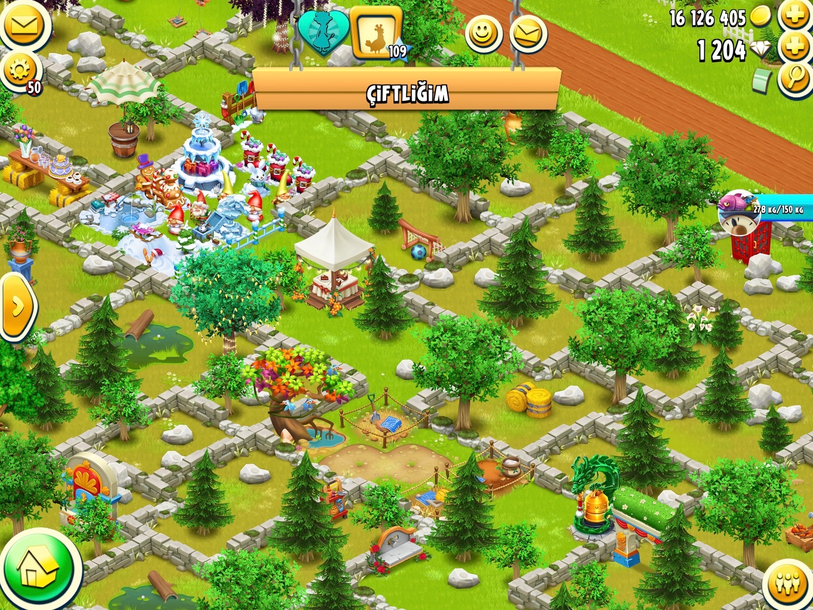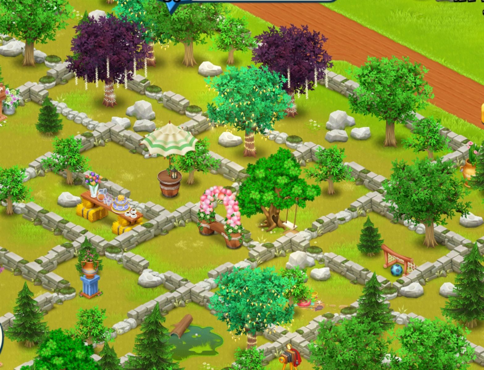 Dahinter ist der Pfad als teilweise "Rhombe" angeordnet, und an dessen Spitze wieder eine Custom-Deko. Danach kommt wieder ein freier Teil, wo der Pavillon draufsteht, danach das Stück mit der vielen Deko, und an dem unteren Ende ist der "Eis-Zaun", den es auch mal als Deko von SC gegeben hat.