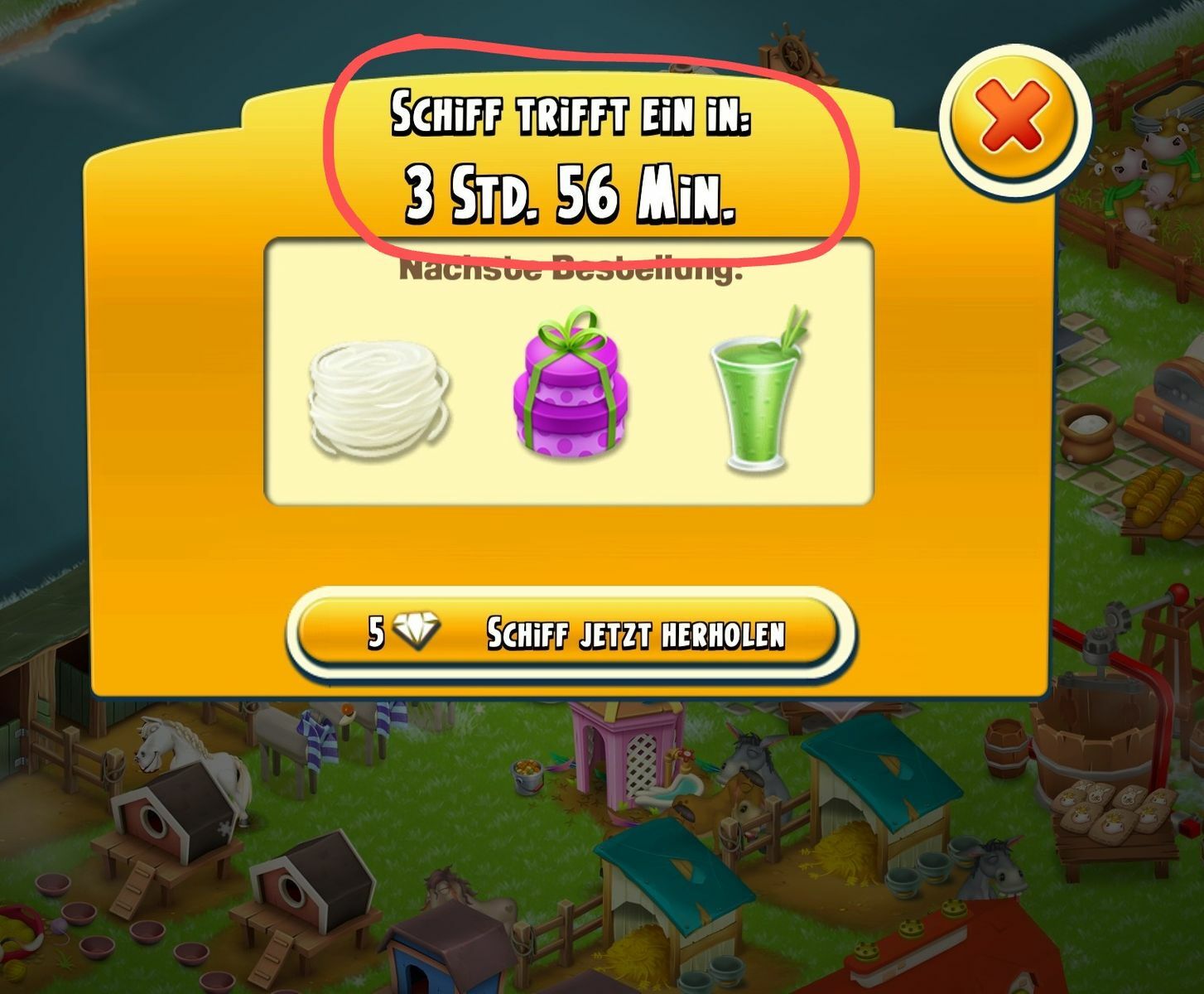 Im Grunde genommen hätte man dieses Schiff also noch vor dem Ereignisende um 9.00 abfertigen können, indem man es mit Diamanten sofort geholt hätte. Inwieweit man dann noch Geschenke einsetzen und dafür Beeren erhalten hätte, bleibt offen. Und die einzige Möglichkeit für die Beeren wäre dann der Umtausch in Münzen um 9.00. Sehr eng und knapp, aber wäre durchaus noch machbar gewesen.