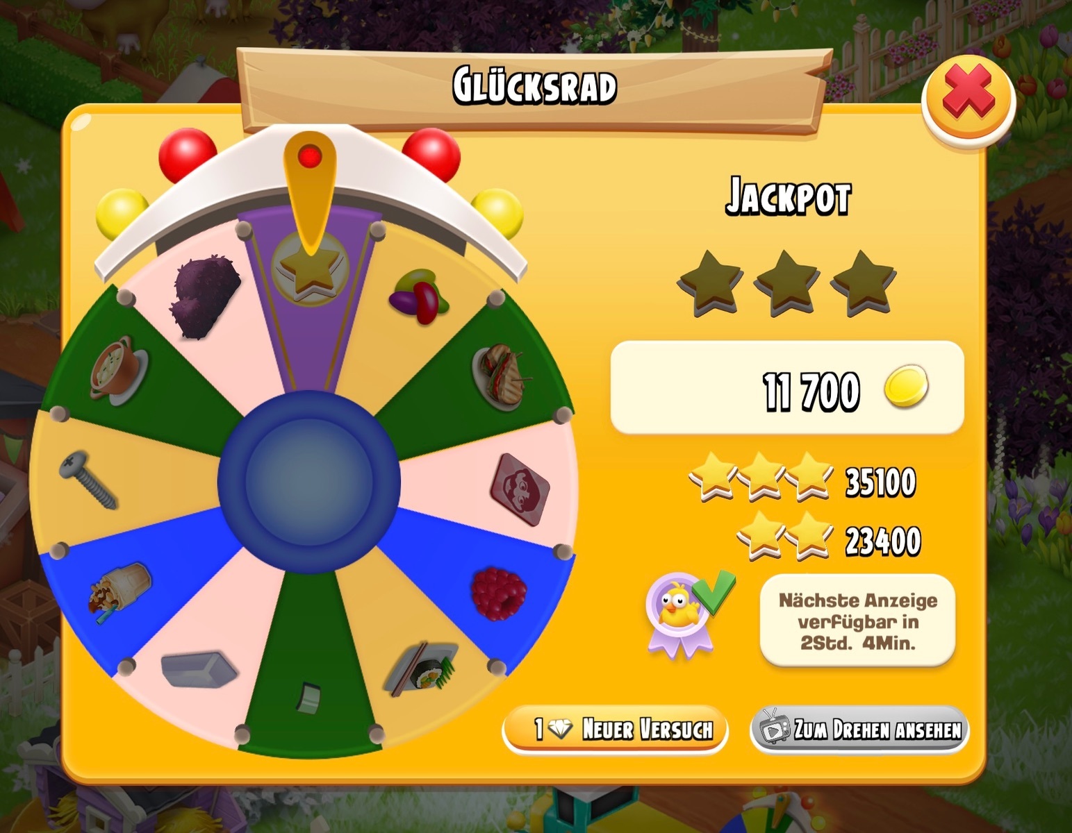 Danke sunside bei mir ist es eigentlich immer so das ich sofort die Filmchen schauen kann und wenn dann um neun das Glücksrad kam, war es die letzten Tage immer so, dass ich direkt drei mal drehen konnte (einmal so, einmal Farmpass und einmal nach dem Werbung schauen). Vielleicht liegt es daran, dass ich heute relativ spät erst ins Spiel geschaut habe und dann noch keine neue Werbung verfügbar war. Werde das morgen mal beobachten. Liebe Grüße und schönes Wochenende