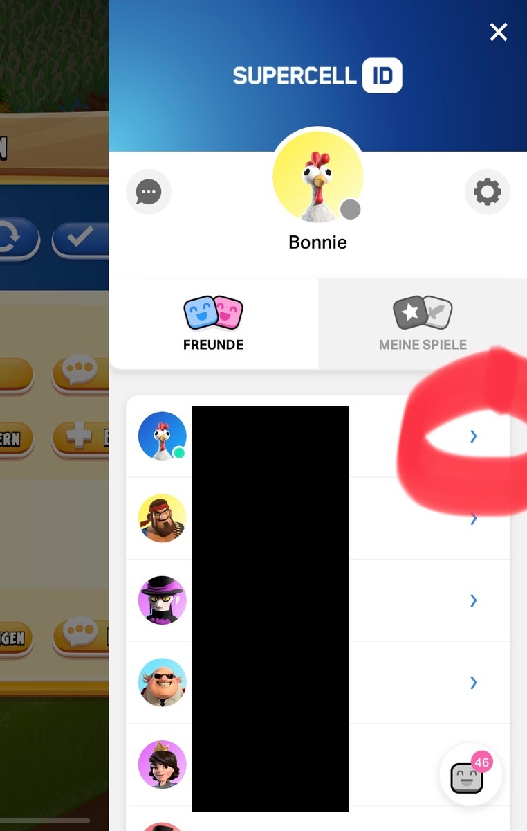 Dann gehst du auf „Freunde“ und suchst deine andere Farm mit der du mit besagten Spieler befreundet bist und tippst rechts davon auf den Pfeil: