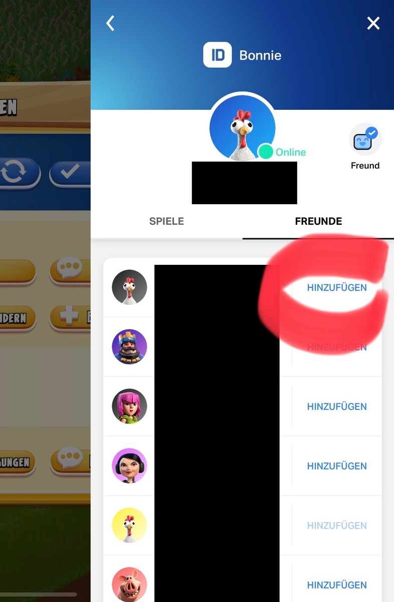 Es erscheint eine Liste mit den Freunden deiner anderen Farm. Du suchst die gewünschte Farm und tippst rechts auf „Hinzufügen“:
