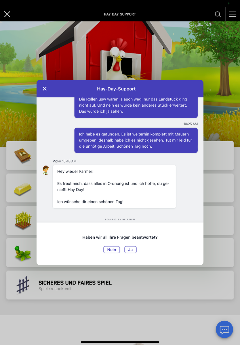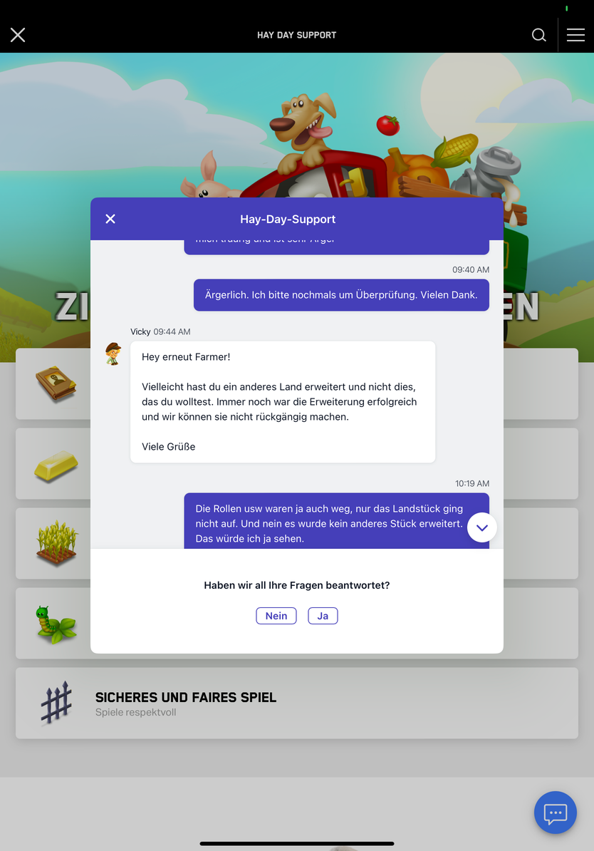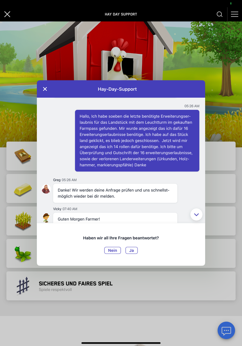 Ich habe drauf geantwortet und es hat 4 Minuten bis zur Antwort vom Support gedauert. Ich habe dann meine Landstücke genau betrachtet. Ich wollte Hayday schon voller Wut beenden und sah plötzlich das ich auf einem Landstück Bäume fällen konnte. Es war trotzdem von Mauern umgeben. Das ist einfach nur komisch mit Mauern umgeben.