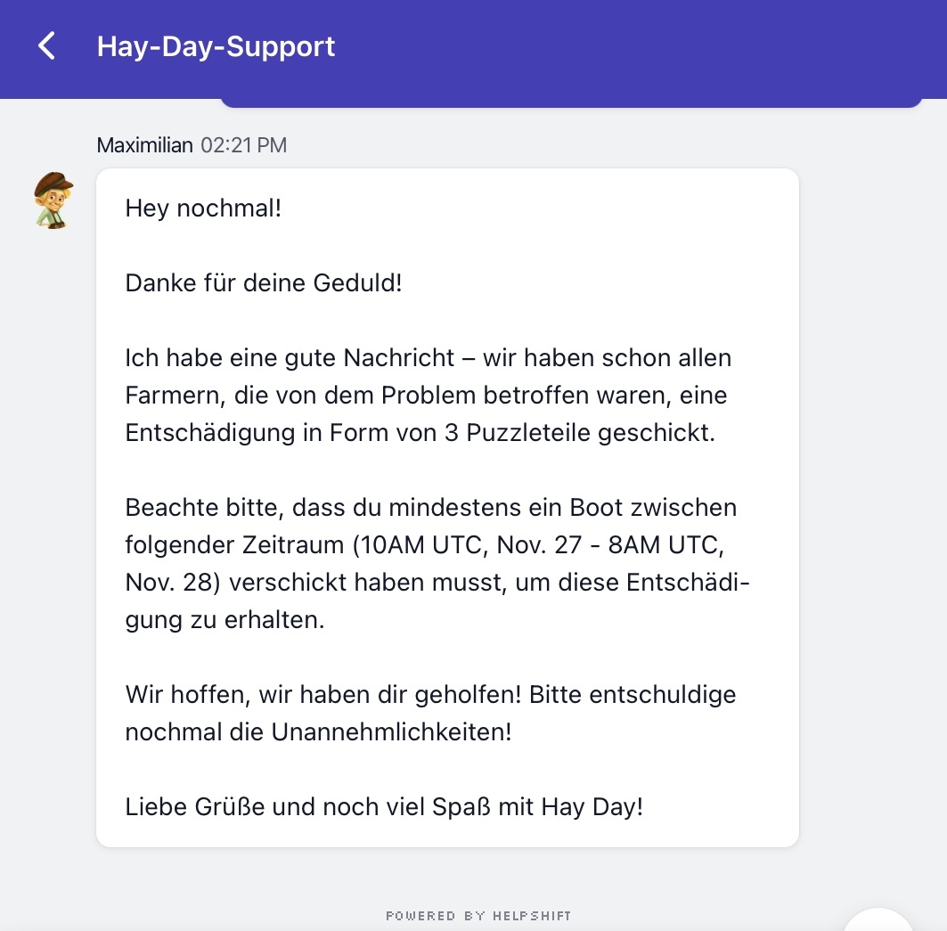 Dazu muss das Problem schon zusätzlich auch an den Hayday Support gemeldet werden.