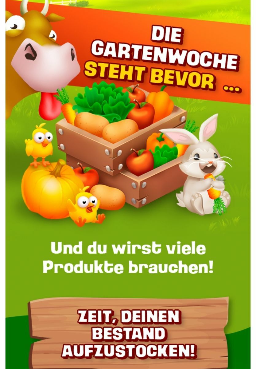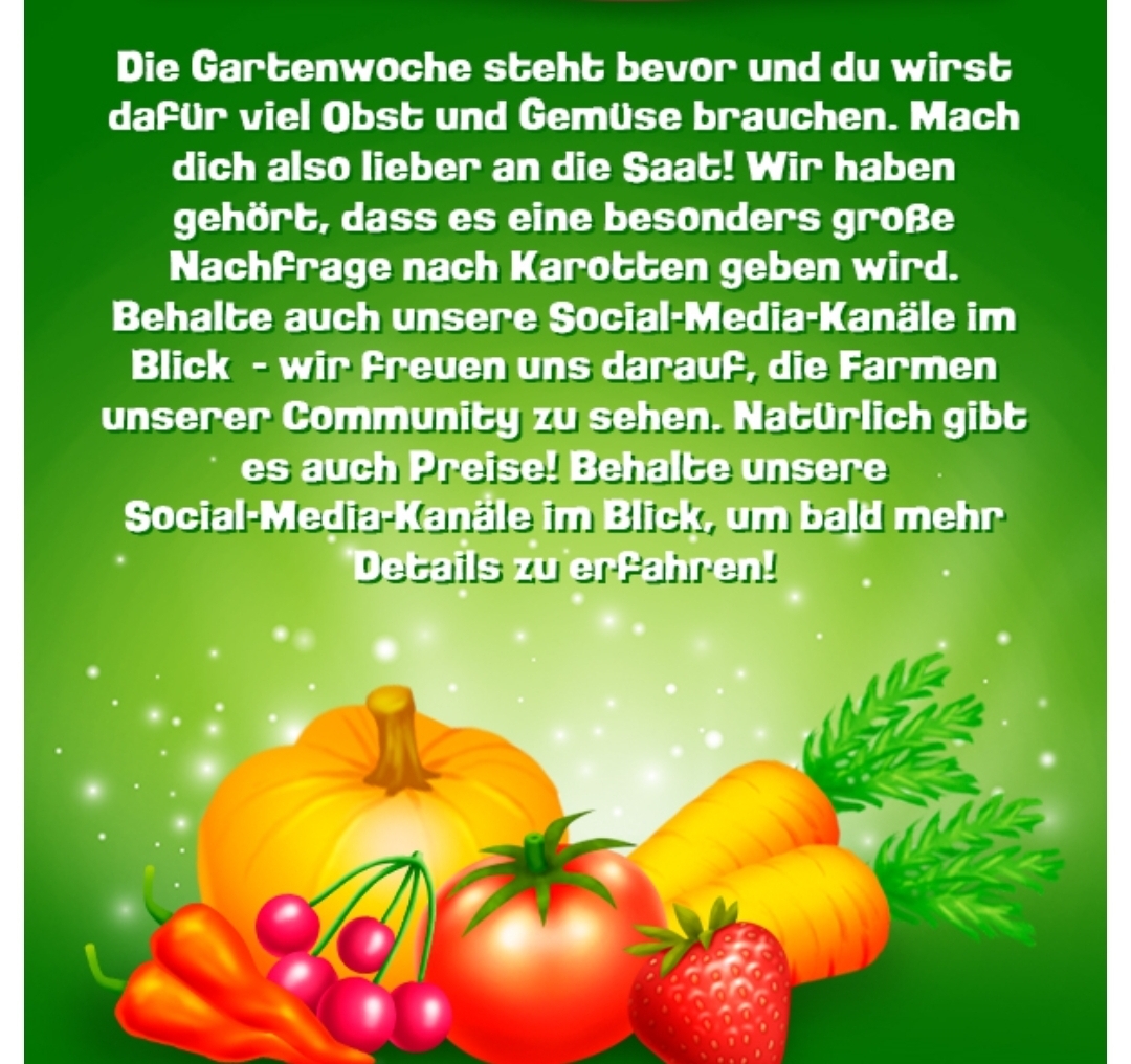 Im Video heißt es bis zum 15 sollen wir uns bevorraten. Und die Content Creator, die die Ereignisse vorab nennen dürfen, haben angekündigt, dass die Gartenwoche am Montag startet und die Farmbesucher jeden TAg nach einem anderen Gemüse fragen.