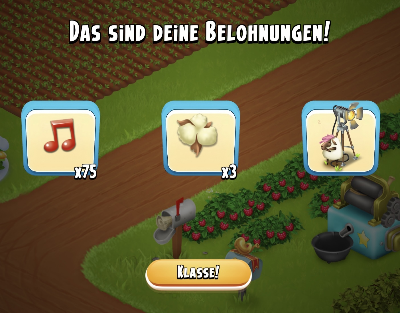 Ich hab jetzt die ersten vier Belohnungen - Drummer, Schild, Zugangskette, Kacheln - geholt.