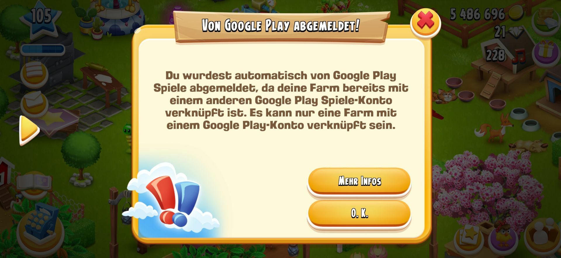 Ansonsten noch mal das Übliche, Cache leeren, Neustart. Bei mir war es danach weg, auch wenn ich Konten gewechselt habe. Ich hab noch Babyfarmen.