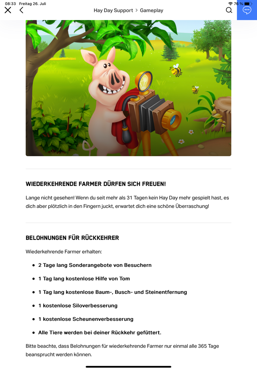 Hallo, ich hab mal gehört, dass man, wenn man lange genug in HayDay pausiert, eine Silo-Erweiterung und eine Scheunen-Erweiterung geschenkt bekommt. Nun meine Fragen, wie lange muss man pausieren (12 Wo hen oder 3 Monate)? Gibt es weitere Geschenke, denn ich hatte, glaube ich mal ein Video von SyromerB gesehen, da sprach er auch von Münzen/Diamenten. Hat es schon jemand probiert und kennt die Antwort?