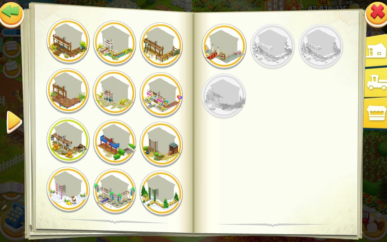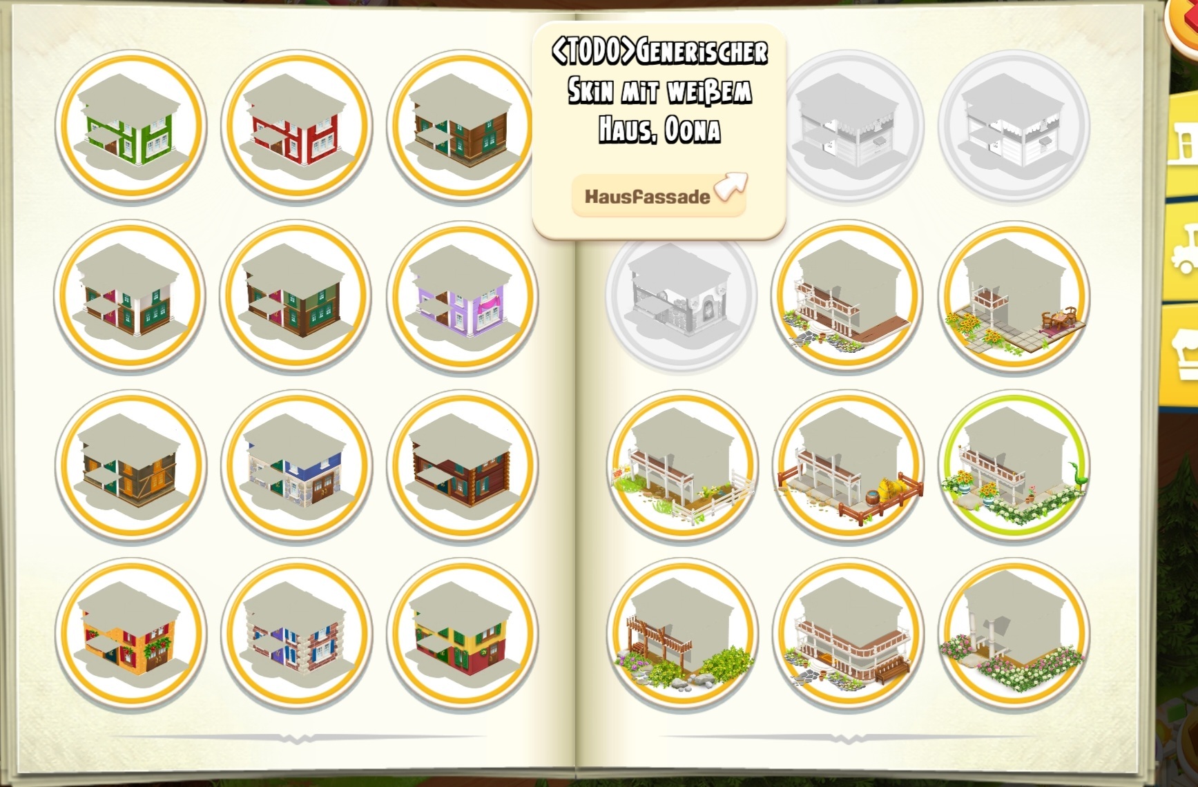 Beim Farmhaus scheint es noch in Arbeit zu sein, ist ja auch hier noch alles grau hinterlegt. In allen drei Kategorien (Hausdach, Hausfassade, Veranda) ist jeweils ein richtiges Design und zwei mit einem Bearbeitungshinweis zu sehen.