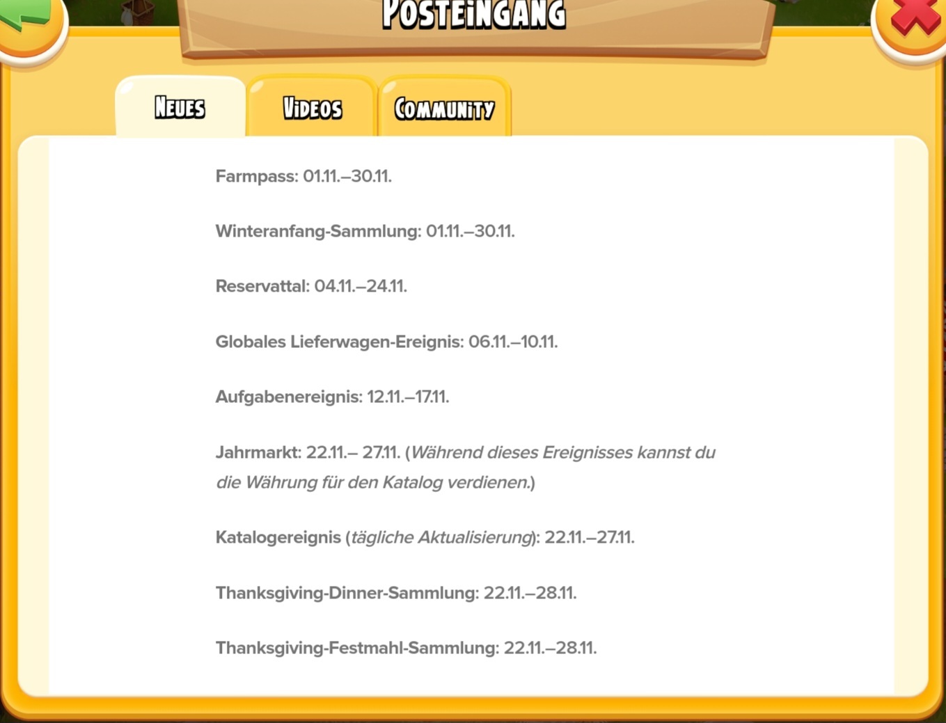 - County-Fair-Event (Deko:Thanksgiving-Gartenlaube) Füllt Körbe, verdient Bänder und schaltet tägliche Überraschungen frei, darunter eine neue temporäre Währung! Mit dieser könnt ihr dann im neuen Katalog, der täglich aktualisiert wird, einkaufen. Ausserdem bekommt ihr diese Währung über die Tagesbelohnung und in Gratisangeboten geschenkt.