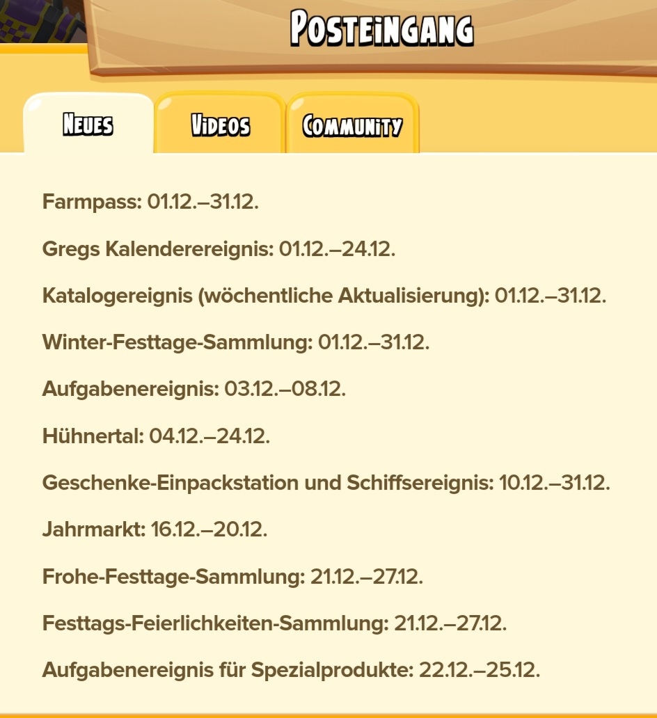 Das Update kommt vermutlich morgen Montag. Die Geschenkeinpackmaschine in der die Winterbeeren-Geschenke produziert werden soll lt. Dairy News am Tag nach dem Update kommen. Das wäre dann am Dienstag, 03.12.