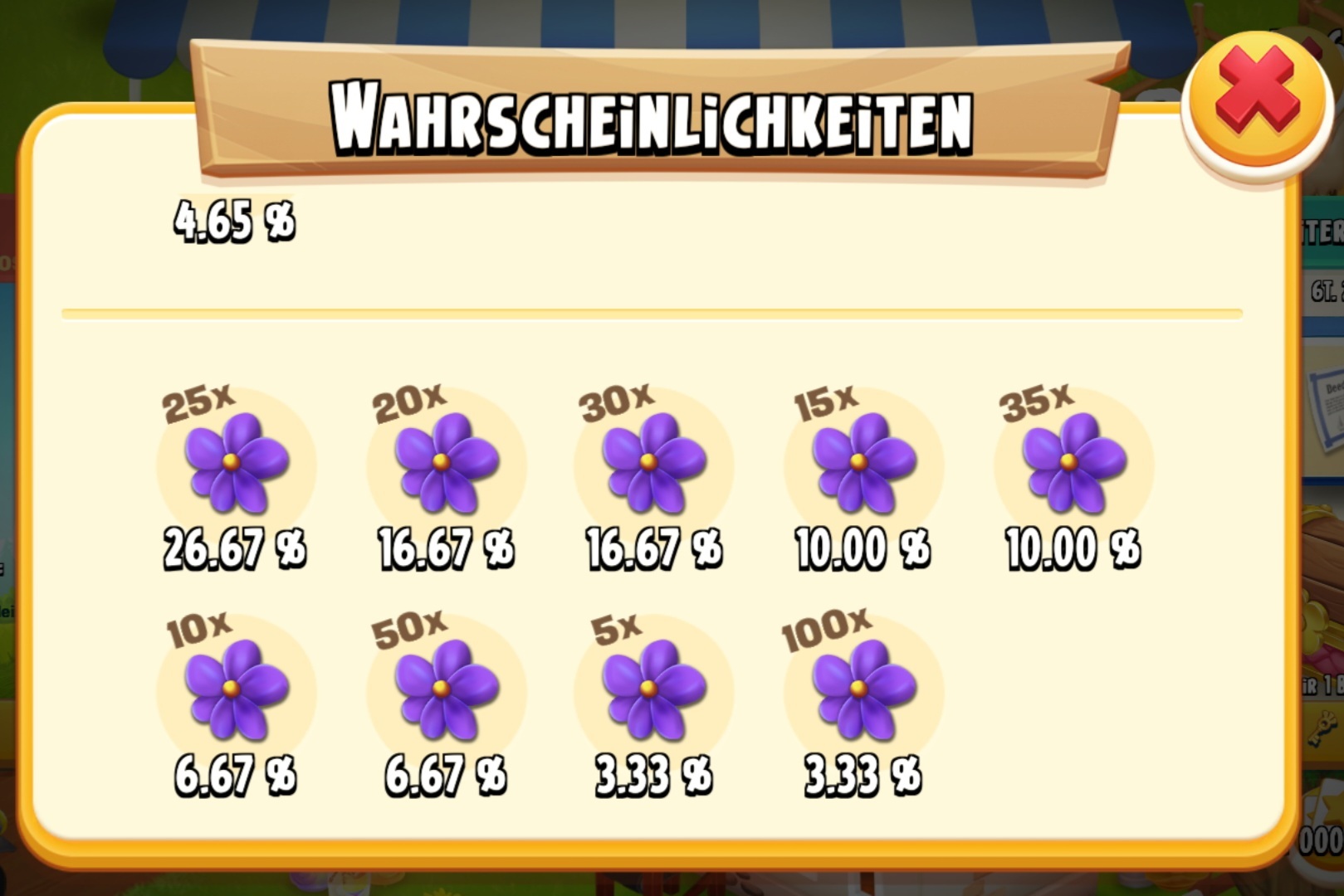 #15 Alles anzeigenBei den Überraschungskisten gibt es scheinbar auch Blüten dabei. Man kann bei den Wahrscheinlichkeiten nach unten scrollen.
