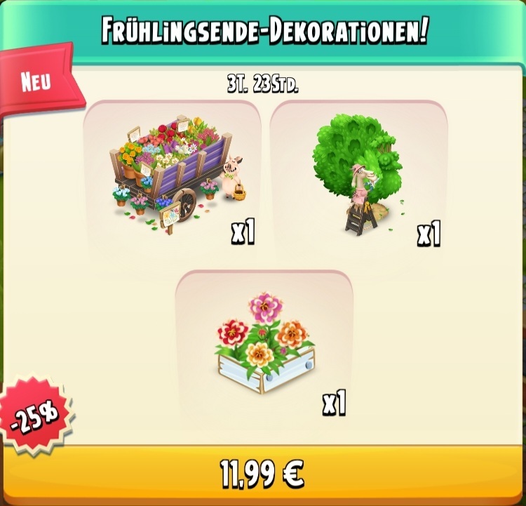 Alles anzeigenUpps, da handelt es sich wohl um ein Missverständnis. Das war keine Kaufempfehlung, schon gar nicht von mir! Ich kaufe seit Jahren exakt nix, null, niente, nada: keinen Farmpass, keine Dekos..