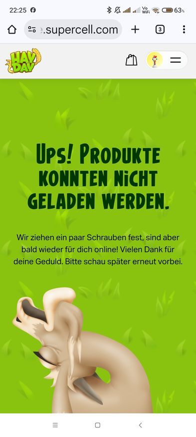 Ich mach dann einfach die --> Hauptseite Supercell Store deutsch nochmal auf und geh auf Hayday. Beim zweiten Mal hat es bisher immer geklappt.