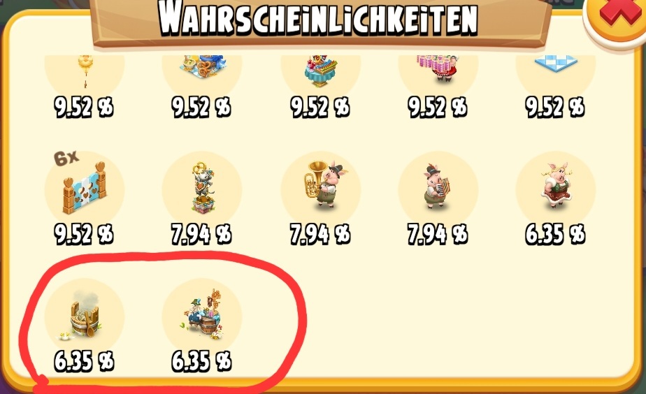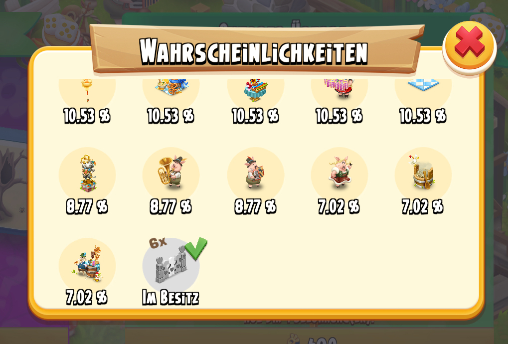 Ich hab bereits alles aus der Schlüsselkiste "Oktober-Überraschung" im Laufe der Zeit erhalten, außer dem Sauerkrautfaß und dem Brezelstand. Die Wahrscheinlichkeit liegt bei mir noch bei 6,35 % und anscheinend steigt die Wahrscheinlichkeit dafür auch nur sehr geringfügig.
