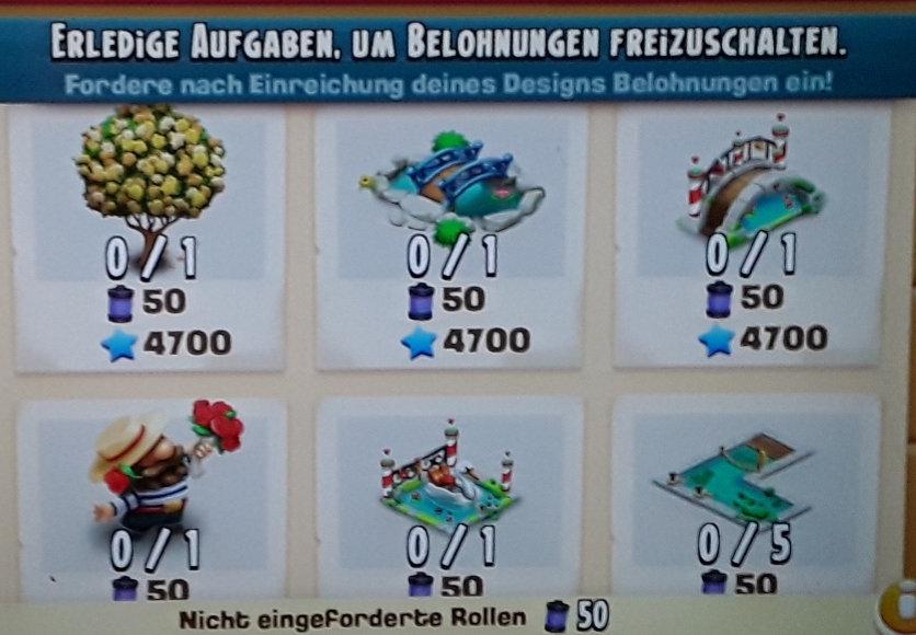 Im Belohnungskatalog interressieren mich bislang lediglich die 2x3 Venezianischen Kanäle für meine nächste Bäderlandschaft und die goldenen Schlüssel. Evtl. noch die ein oder andere 1* Toolbox zur Balance meiner Tools.