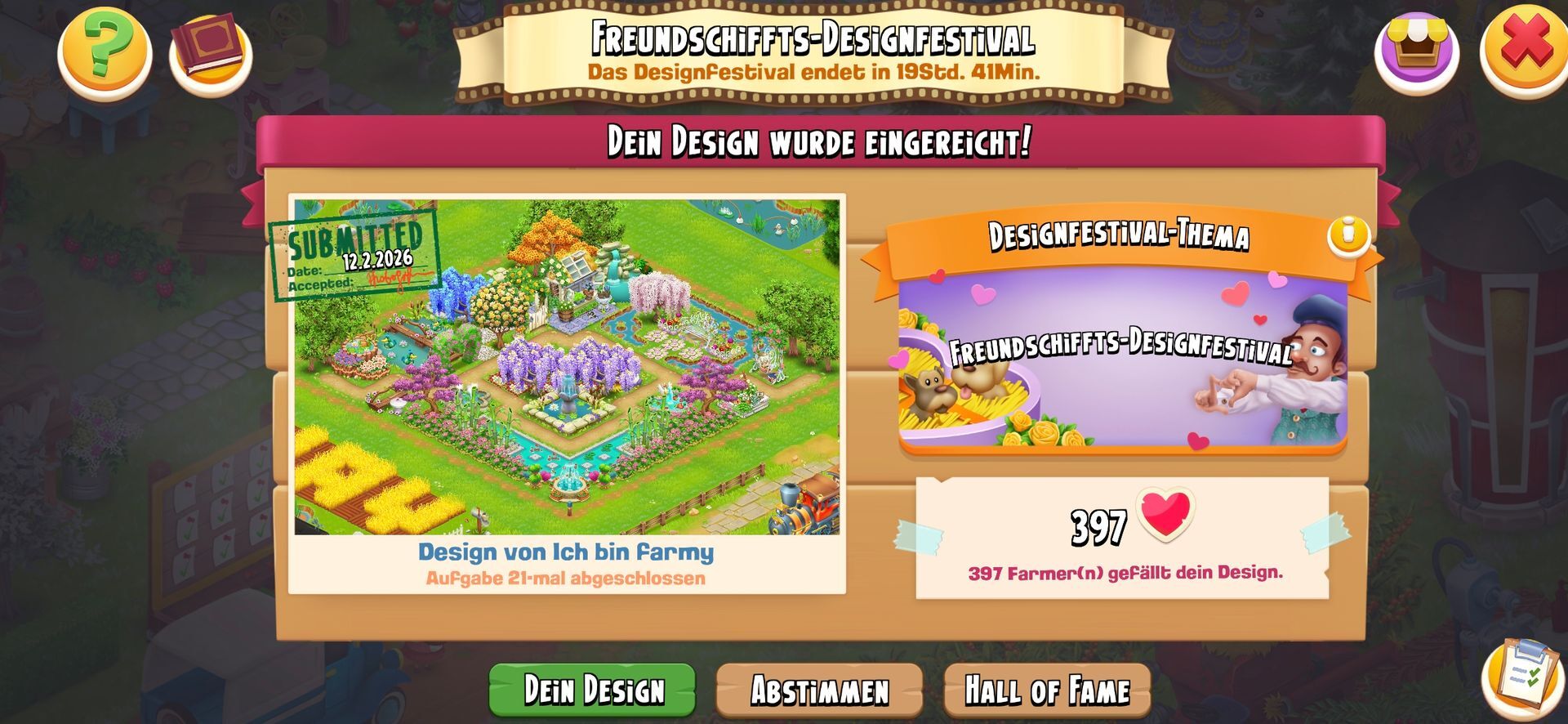#152 Bei mir machte mit erheblichem Vorsprung meine zweite Farm das Rennen. Gestern Nacht stimmten vollkommen unerwartet noch über 100 Farmer für deren Design, womit sie das Ereignis mit sehr guten 250 Likes abschließen konnte.