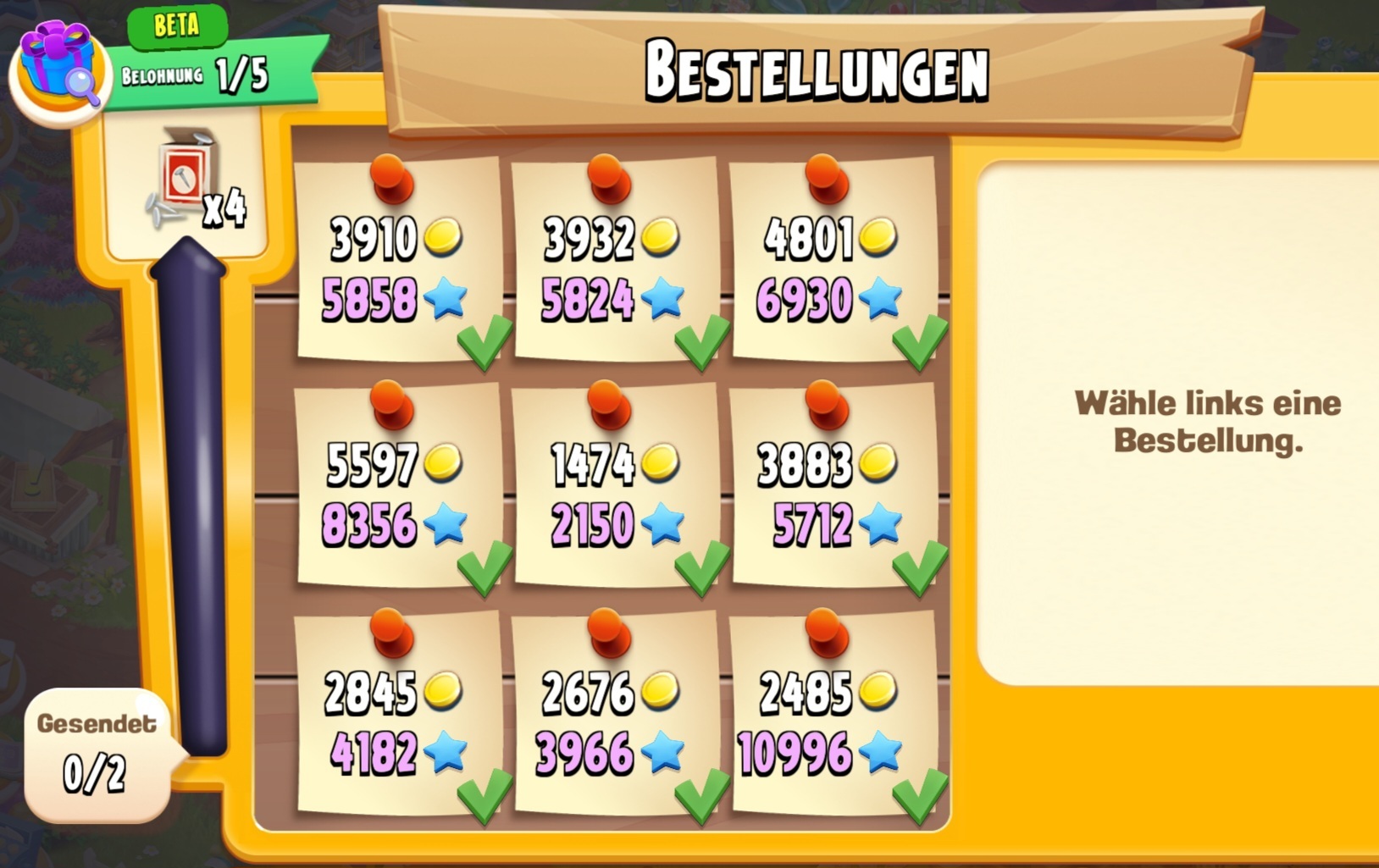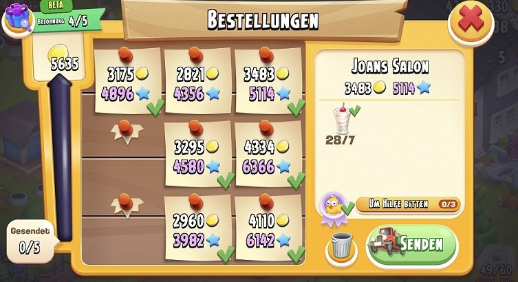 Man bekommt bis zu 5 Belohnungen. Die Anzahl der 🚚, die man wegschicken muß variiert von 2 - 5 Lieferungen.