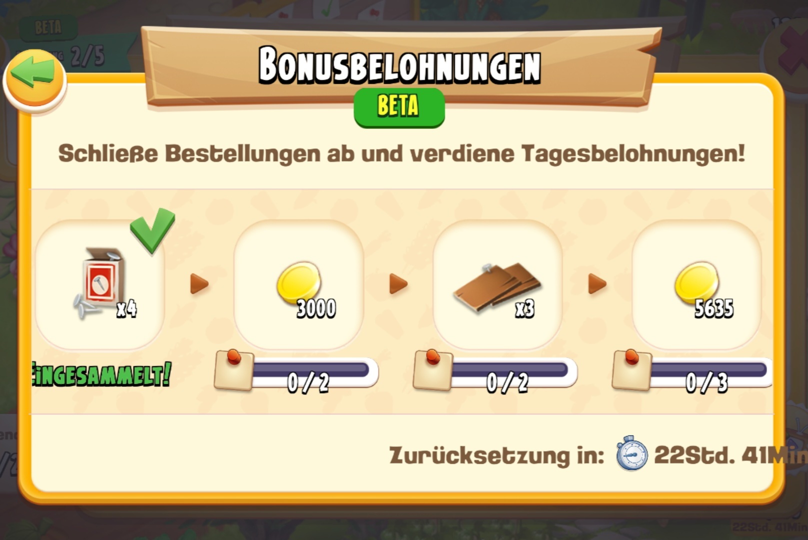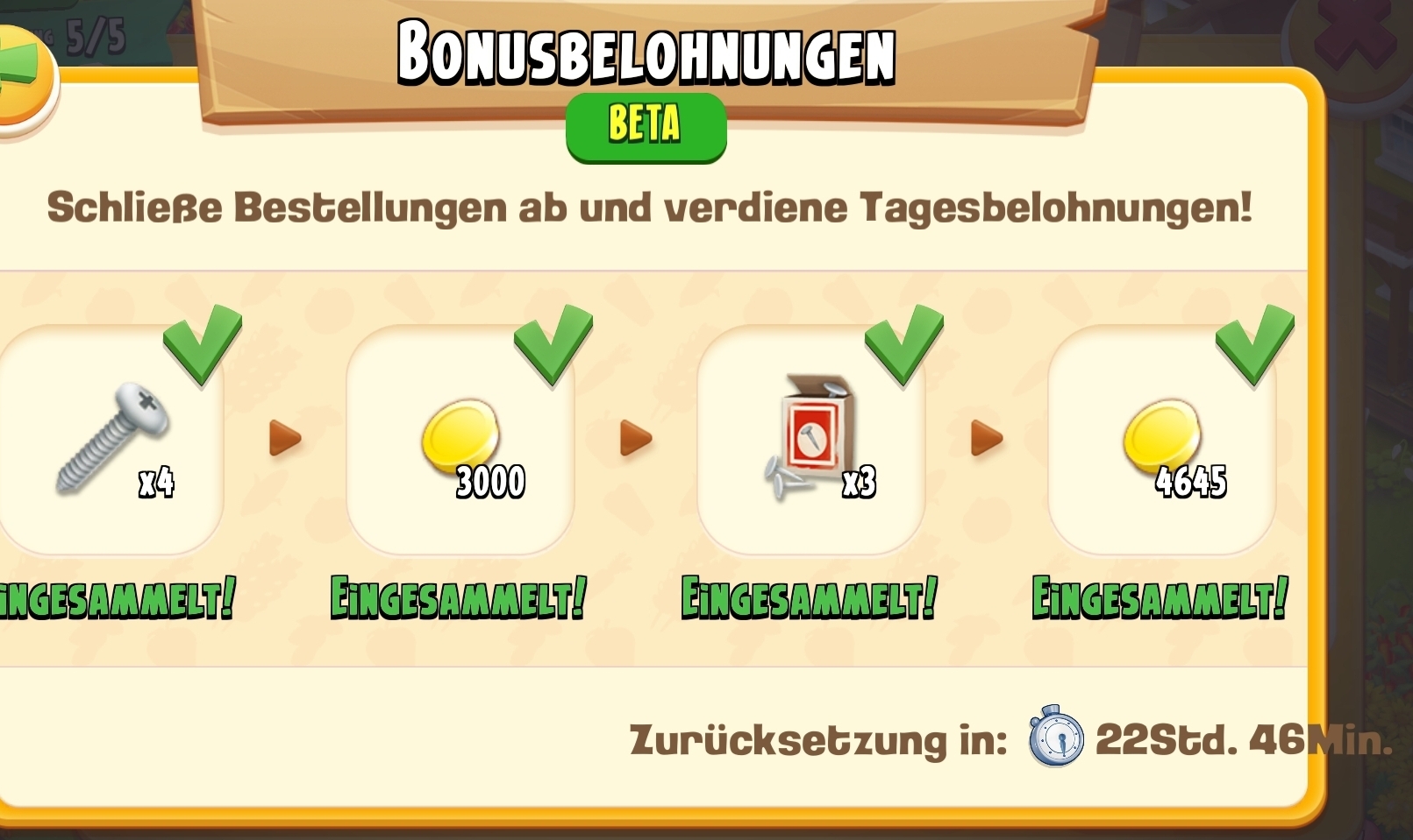 Bis jetzt hatte ich als Zusatzbelohnung für 4 Lieferungen 4 Schrauben, dann gab es für 3 Lieferungen Münzen (die Menge wird wohl Level abhängig sein) und dann für 3 Lieferungen 3 Nägel und jetzt wieder Münzen für 5 Lieferungen 5635 Münzen, dann gibt es noch eine Belohnung