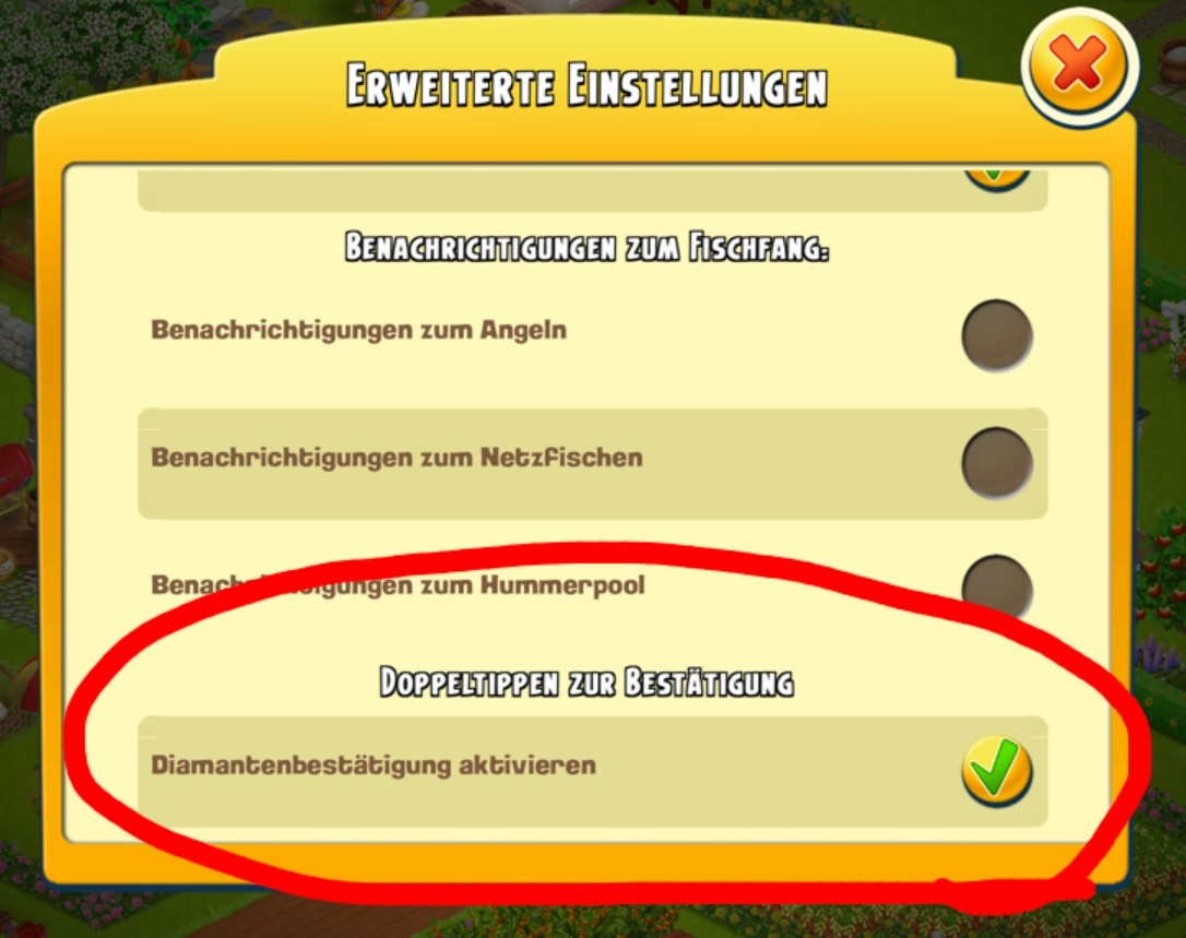 Es wurde hier ja schon oft diskutiert, dass man sich einen Button für eine Diamantenbestätigung wünscht. Ich denke jedem ist es schon passiert, dass er/sie aus Versehen einen oder mehrere Diamanten "verschwendet" hat und sich danacht total geärgert hat. Per Zufall bin ich auf eben diesen Button gestossen und hab mich gleich sooo gefreut :jipii: und ich habe gleich schon einige Diamanten gespart. Ich weiss nicht, wie lange es den schon gibt oder ob er sogar schon immer da war, aber das ist ja nicht so wichtig. Jedenfalls möchte ich hiermit allen helfen, die immer noch unnötig Diamanten verschwenden. Den Button findet ihr beim gelben Zahnrädchen in der oberen linken Ecke. Dann müsst ihr zu den erweiterten Einstellungen gehen und ganz nach unten scrollen. Es ist der unterste Beitrag, heisst "Doppeltippen zur Diamantbestätigung" oder so ähnlich :D