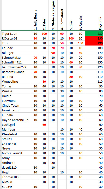 über den dritten Platz mit 180 Punkten kann sich Felidae freuen.Zur Punktewertung. Für den 1. Platz gab es 90 Punkte. Wenn die Genauigkeit besser als 98% vom richtigen Wert war, sogar 100.