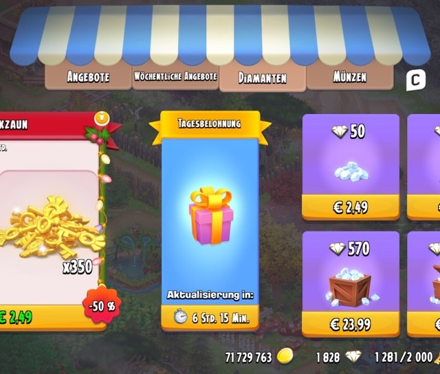 Wenn aber die Aktualisierung der Tagesbelohnung, siehe Bild, völlig willkürliche Zeiten anzeigt, hilft nur abwarten und Tee trinken, meist funktioniert es wieder, wenn die Zeit abgelaufen ist … aber auch nicht immer, ist ein ziemlicher Mist, das ganze!