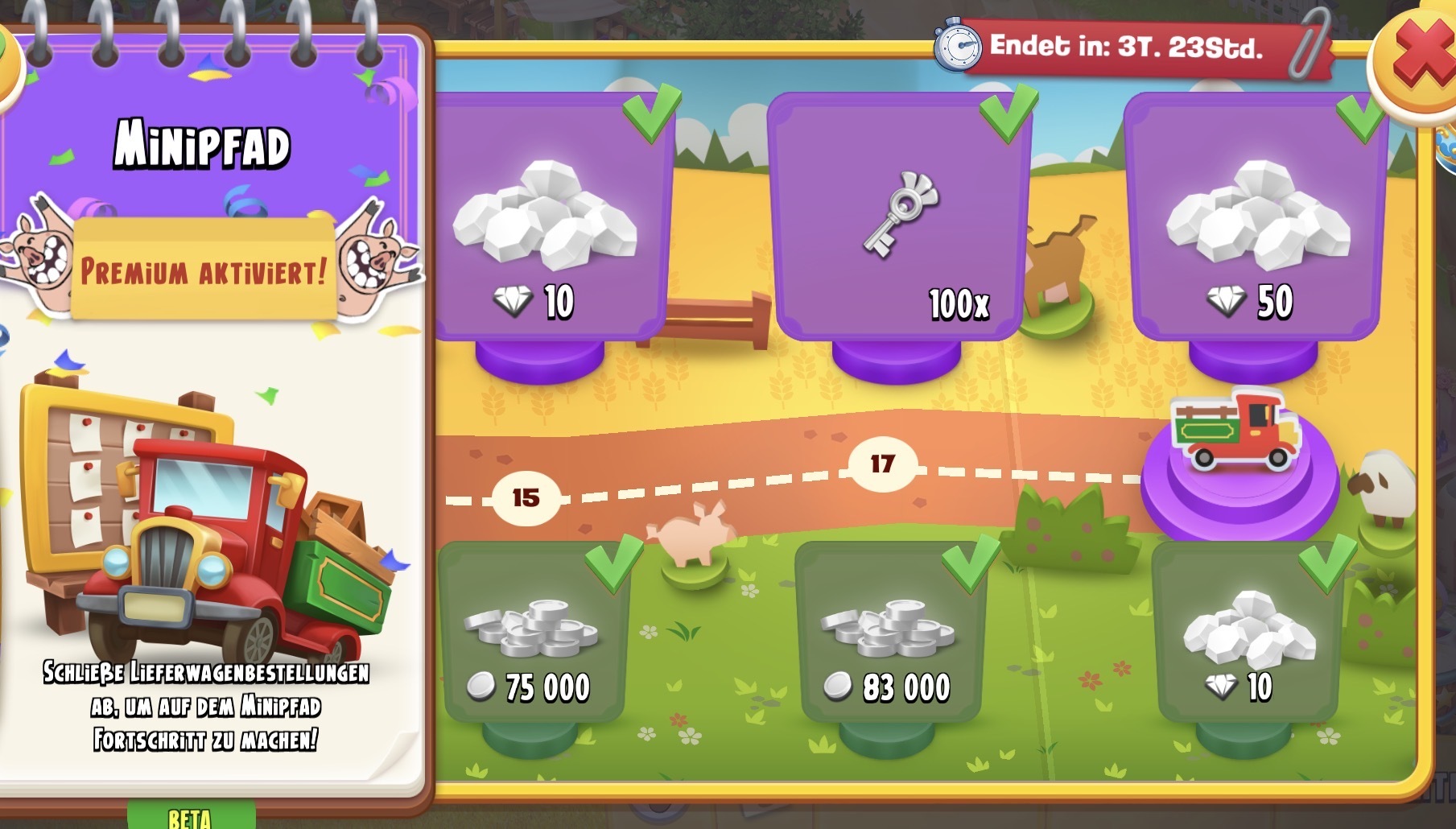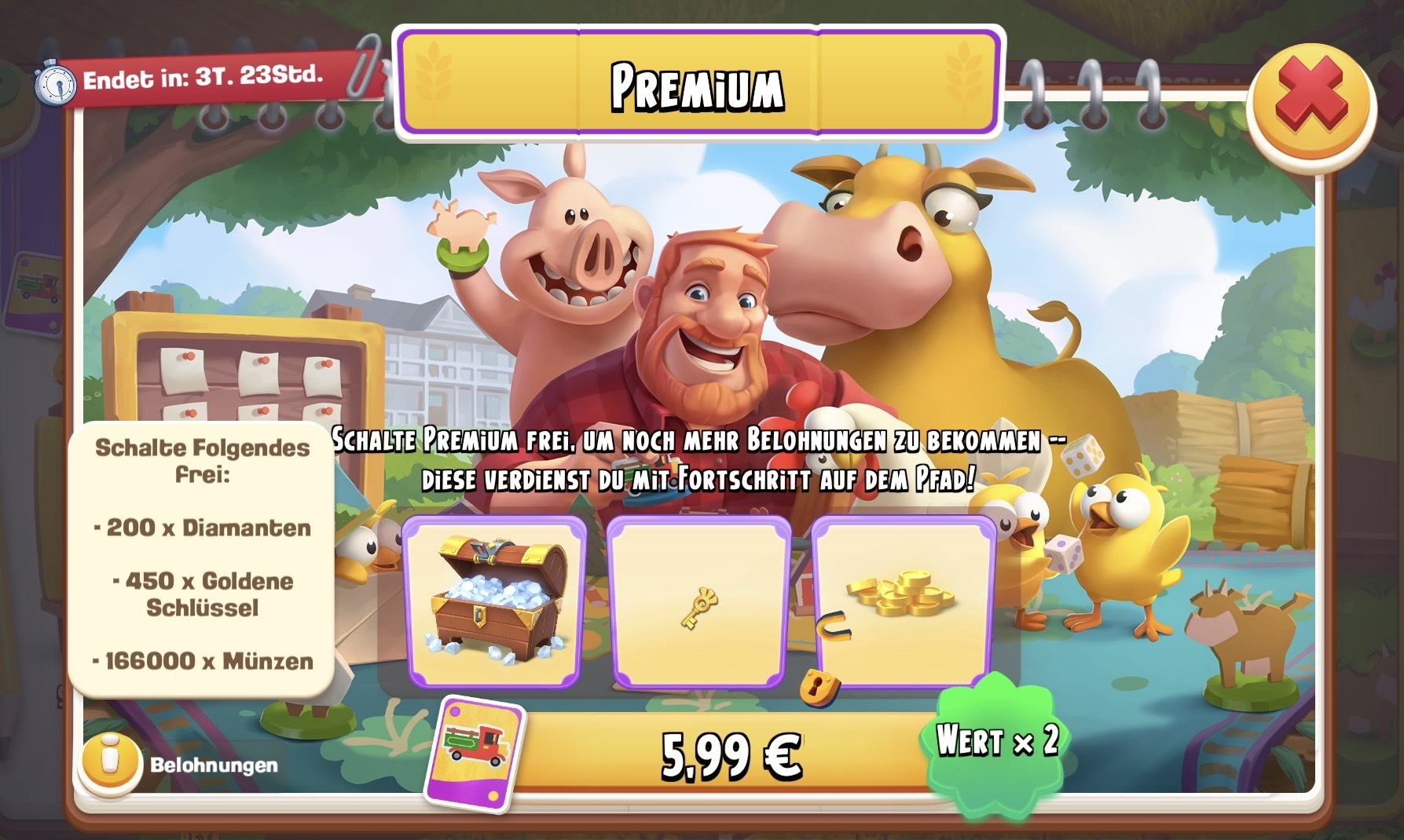 Im normal Pfad nur Schlüssel und Gold, bei premium dann 200 Dias .