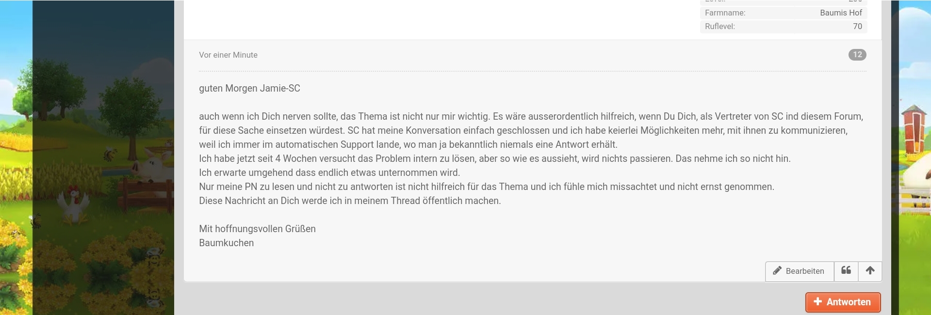 Ich erinnere SC nochmal an ihre eigenen AGB und ersuche diese auch einzuhalten.. Den Einwurf dass man Farmnamen auch ändern kann lasse ich nur bedingt gelten, denn Gemeinschaftsnamen können nicht geändert werden und das ist der Punkt an dem eingegriffen werden sollte.