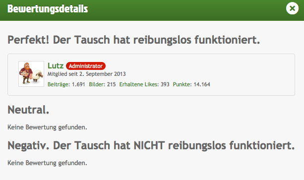 Diese Maßnahme soll die Transparenz der Tauschgeschäfte erhöhen, und vor möglichen Betrügern warnen.Für jede abgegebene Bewertung bekommt der bewertende 10 Aktivitätspunkte gutgeschrieben.