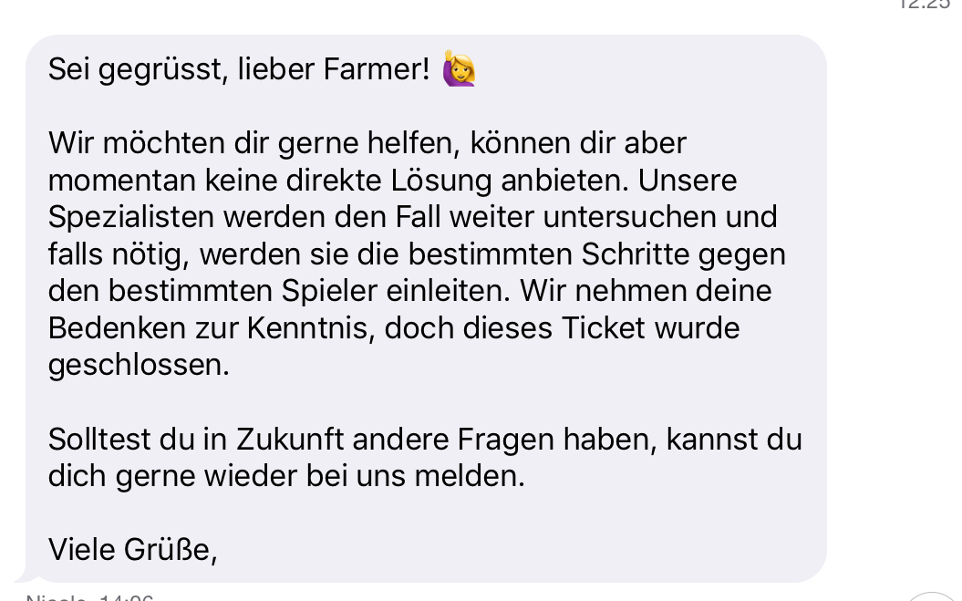 Und es macht auch überhaupt keinen Spaß so lange mit voller Scheune zu spielen weil man nicht tauschen und ausbauen kann. Das kann es einem schon vergraulen. Aber wahrscheinlich ist das Spiel nicht wichtig genug und der Umsatz zu wenig um es vor Angreifern von aussen abzusichern. Aber ich hoffe immer noch, dass wir vielleicht irgendwann mal gehört/gelesen werden.